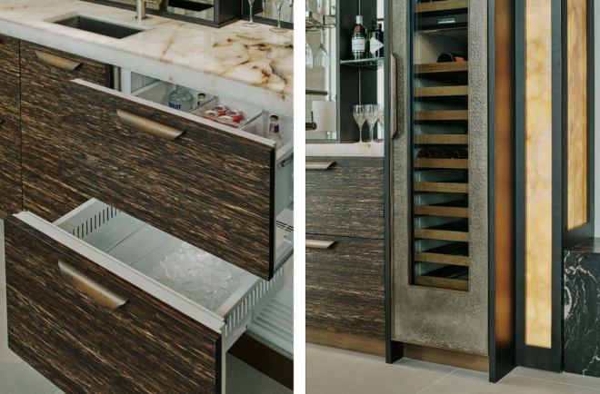 “Sometimes more is more," says Charlie, referring to the bar he created for a home in Malta (above). “The bar includes all the essentials, such as shelves for bottles and racks for glasses, while the black palm cupboards below conceal fridges and an icemaker. The bar is bookended by not one but two wine coolers with hammered pewter and resin panelled fronts. For a touch of pure theatre, the worktop is underlit with crystal quartzite, and the whole piece is framed in backlit honeyed onyx, lighting up the bar at night. It doesn’t get much more glamorous than that!”