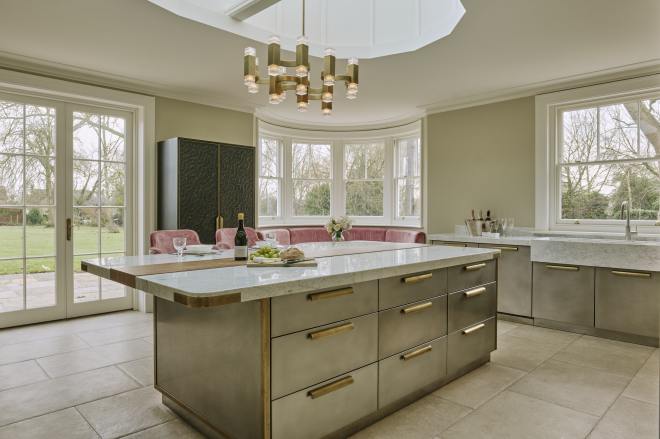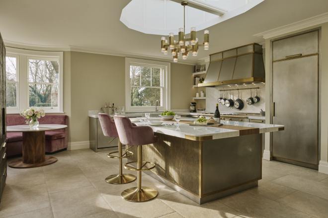 Under the breakfast bar, the island is clad in a single sheet of hand-distressed brass (right), its rich patina lending texture and depth. On the working side, stainless steel drawers gleam with bespoke brass handles, while brass-framed steel panels at each end create a sleek, cohesive finish. Suspended above, a perfectly positioned pendant stylishly illuminates the island.