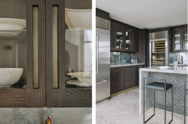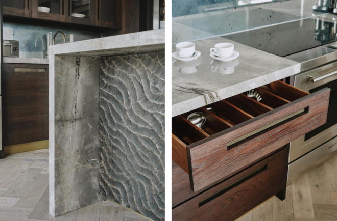 The design for the dark-stained oak cupboard doors began with the cut-out handles, which our client had seen and loved. To add an element of drama, we incorporated brass inlays behind the handles and a matching kick plate. The requested wow factor is in the detail of the beautiful book-matched Fior di Bosco marble waterfall worktop, which cascades down the sides of the island. To make the island stand out even more, we placed a panel of our signature Choppy Water carved oak on the outside. Its grey tones work perfectly with the marble. Finally, the splashback is antique mirror, which offers a suggestion of the views behind without an outright reflection - so much more intriguing, to my mind.