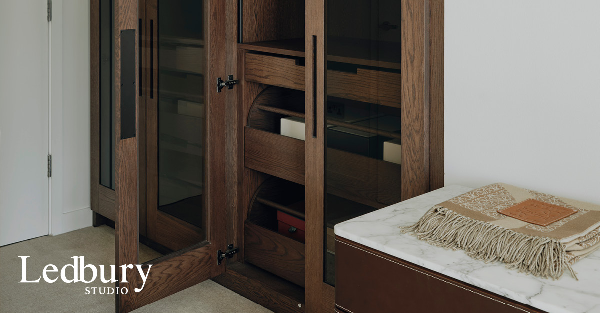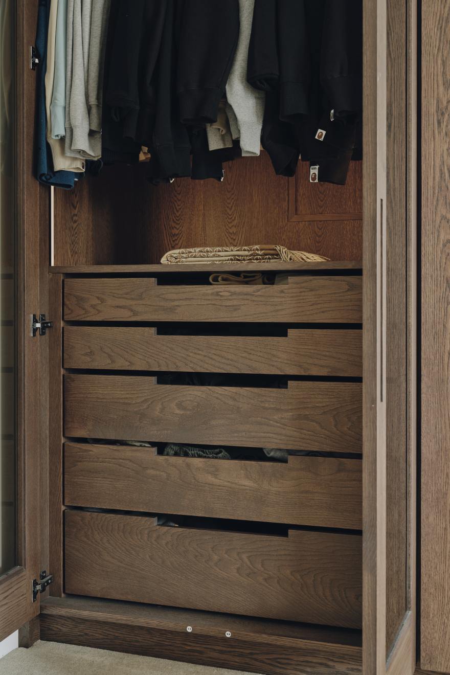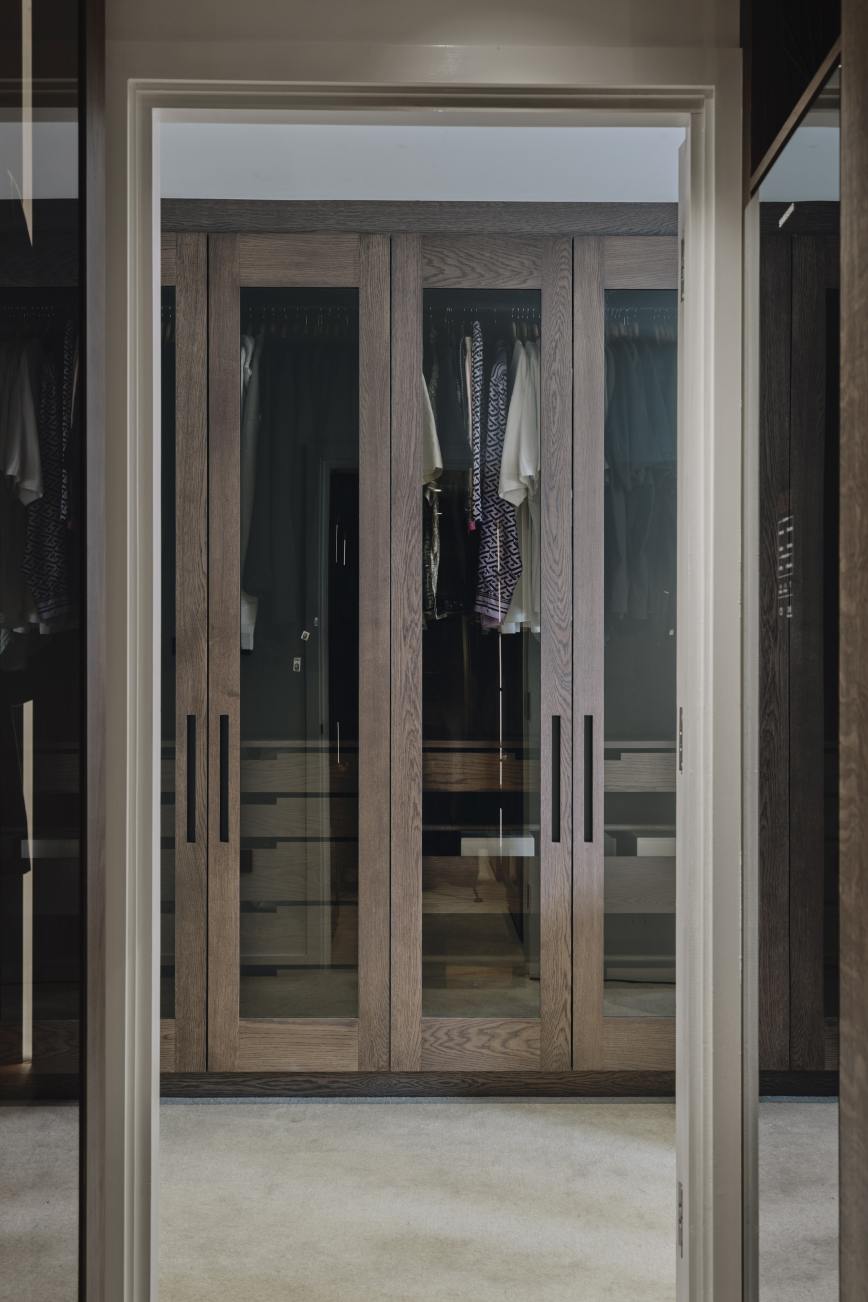 Our client also wanted to maximise the space in his master bedroom with bespoke bedroom cupboards and a dressing room in dark stained oak cabinetry with tall glazed sliding doors which open to reveal bespoke storage solutions to maximise the space. Smoked glass was used on the doors and sepia bronzed mirror with dark oak surround is used to clad a pillar and the back wall of the dressing room, creating the illusion of space.