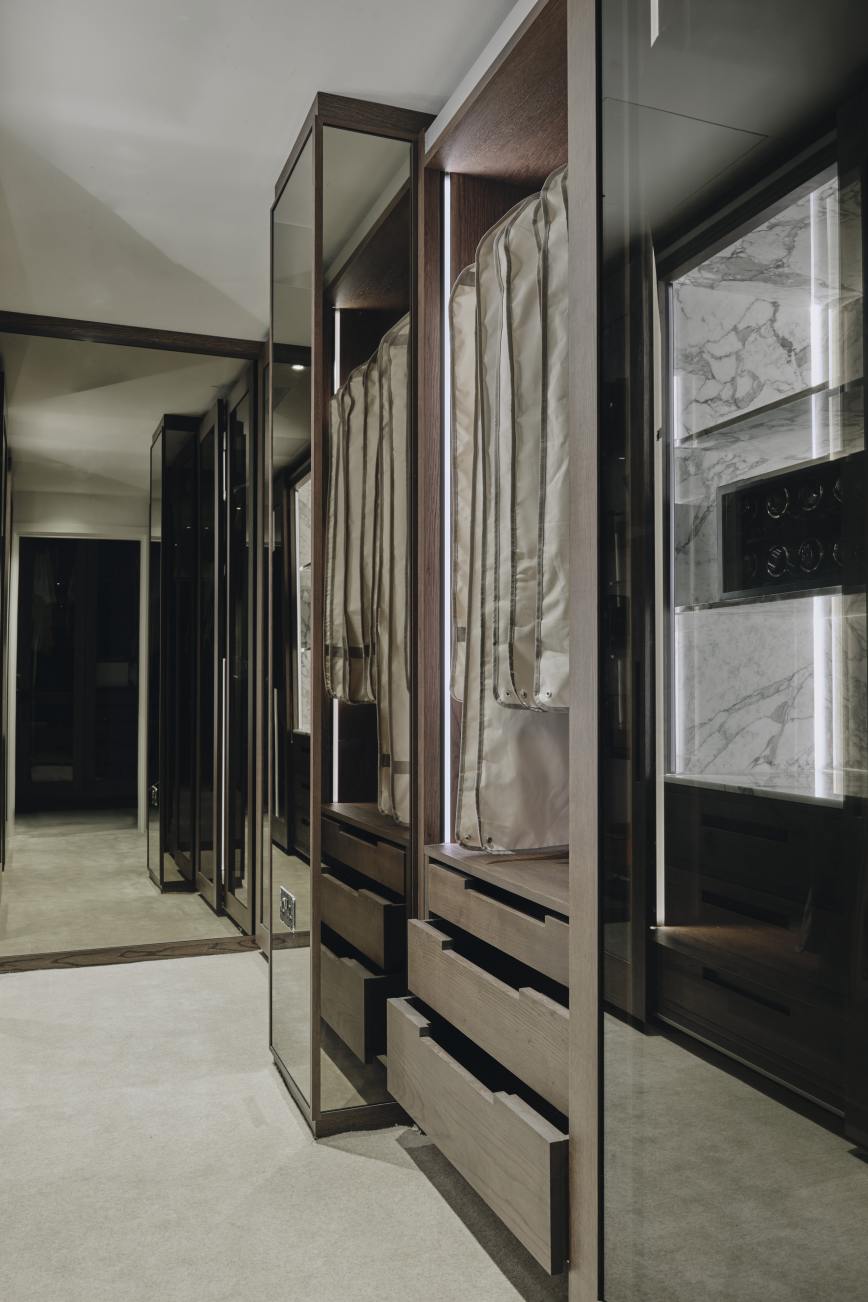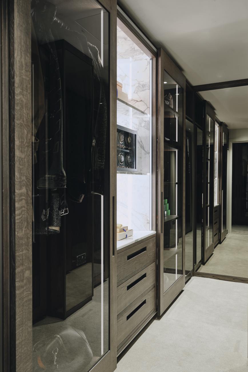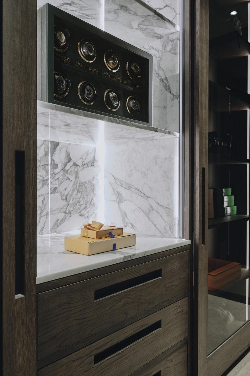 A special area lined with calacatta oro marble was designed to house our client's watch collection, and a cupboard specially tailored to accommodate the client’s air dresser.