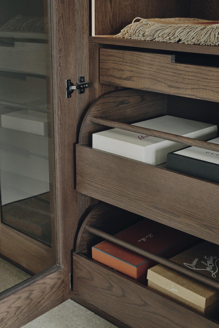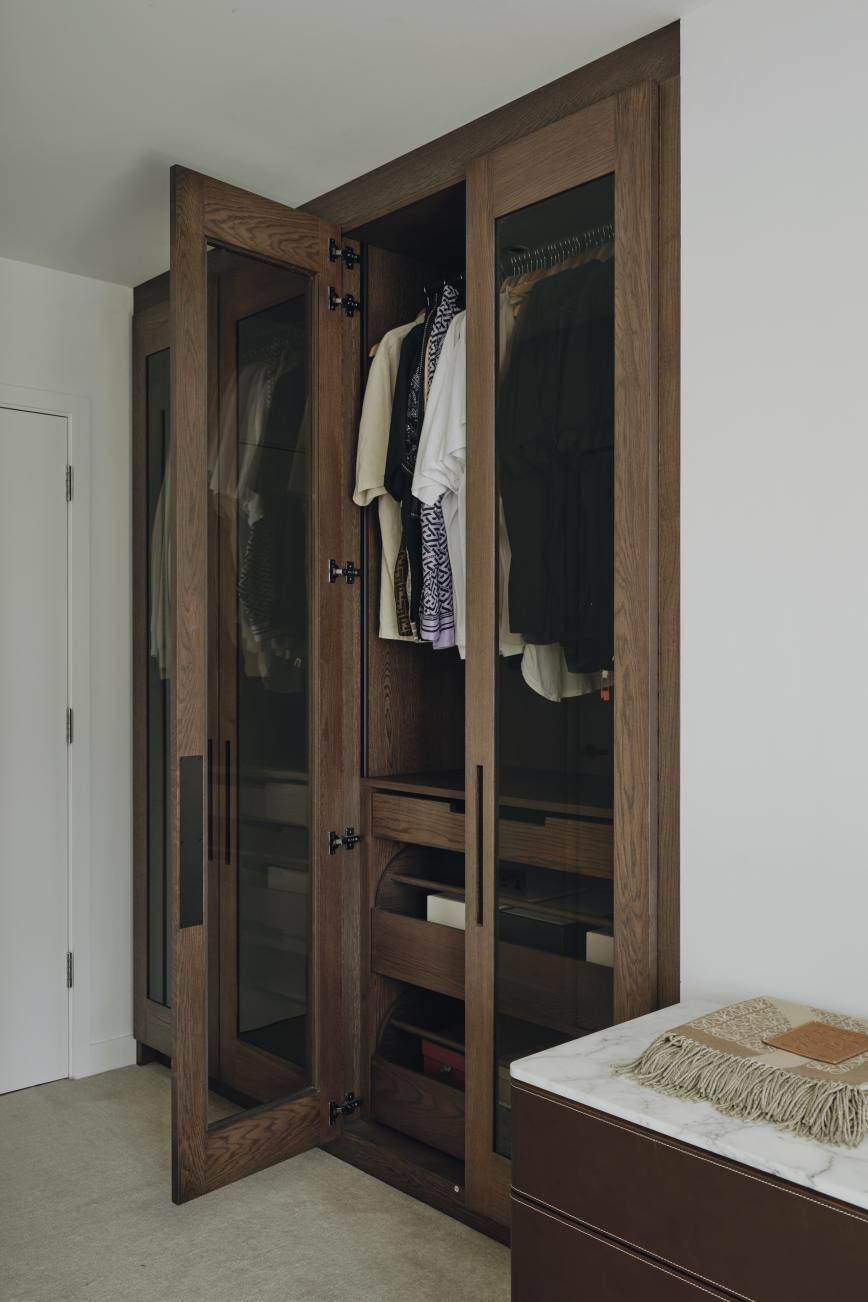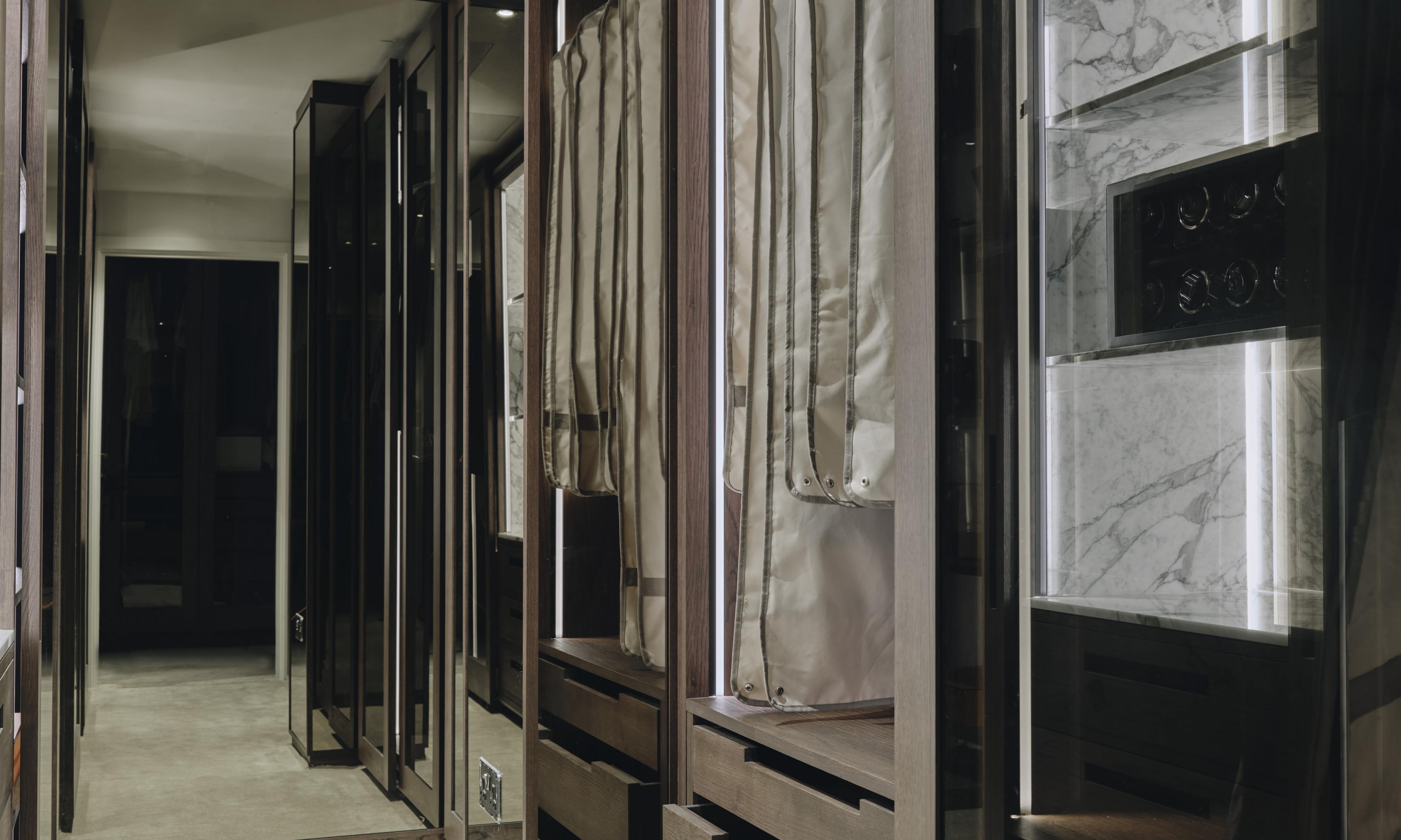 A special area lined with calacatta oro marble was designed to house our client's watch collection, and a cupboard specially tailored to accommodate the client’s air dresser.
