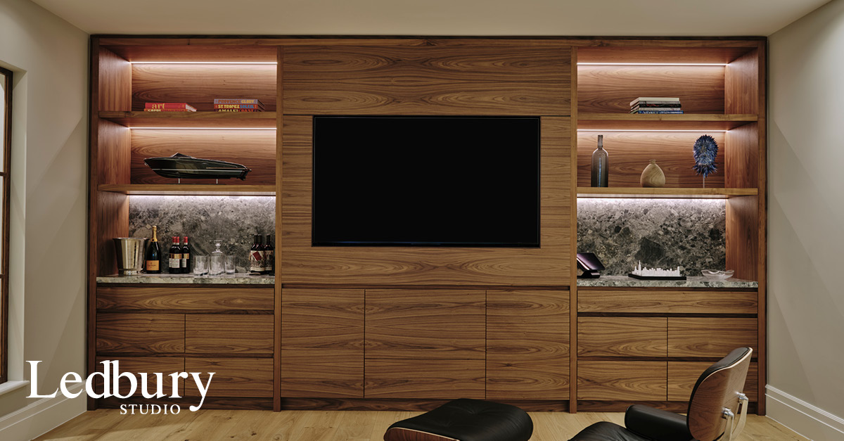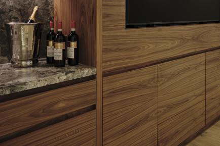 Bespoke media cupboards are becoming more and more a feature of our designs. Here bookmatched walnut veneer was used in this cabinet stretching the width of the room, and specially designed to house a drinks cabinet, TV and sound system, with shelves for display ad storage.