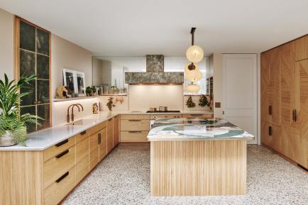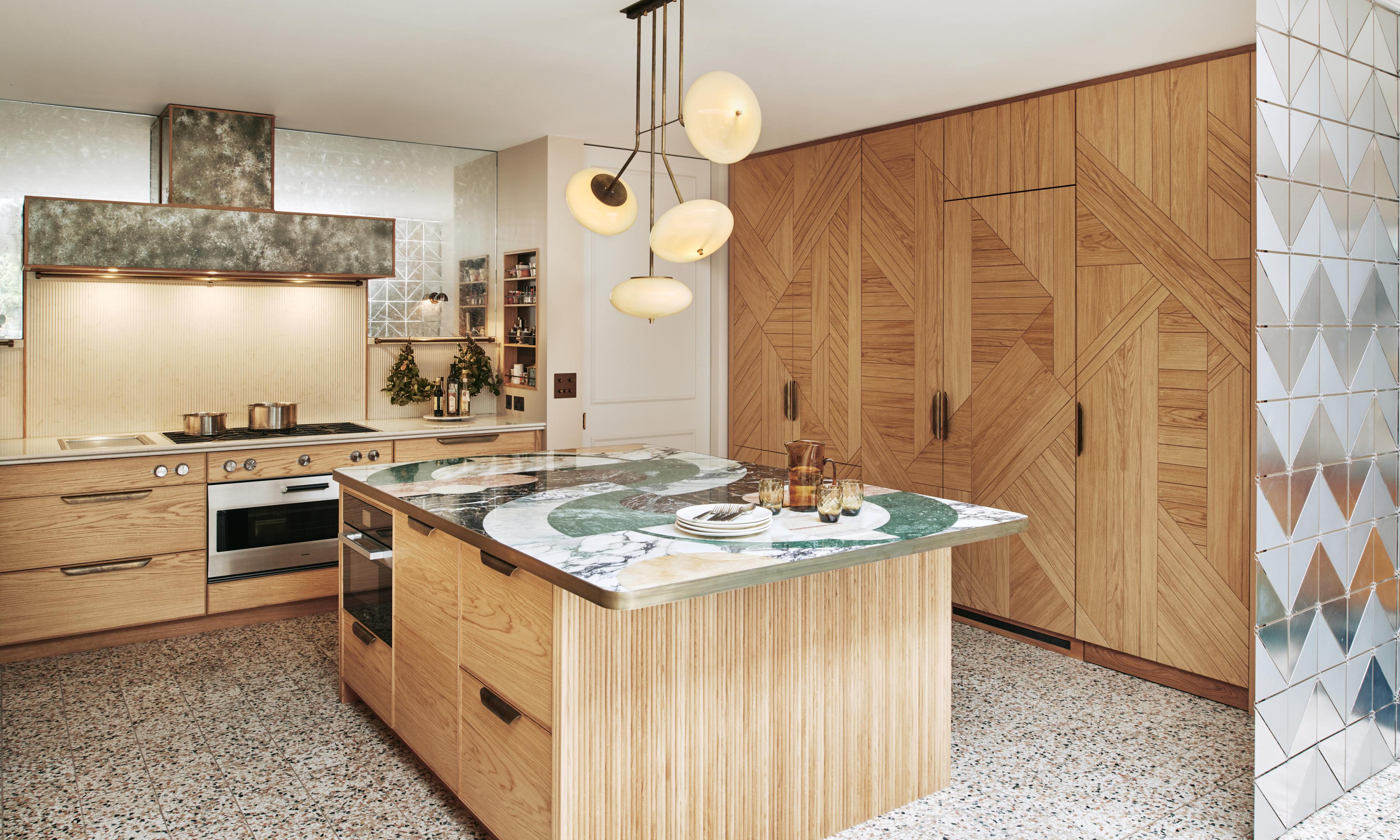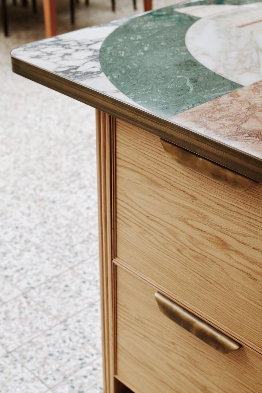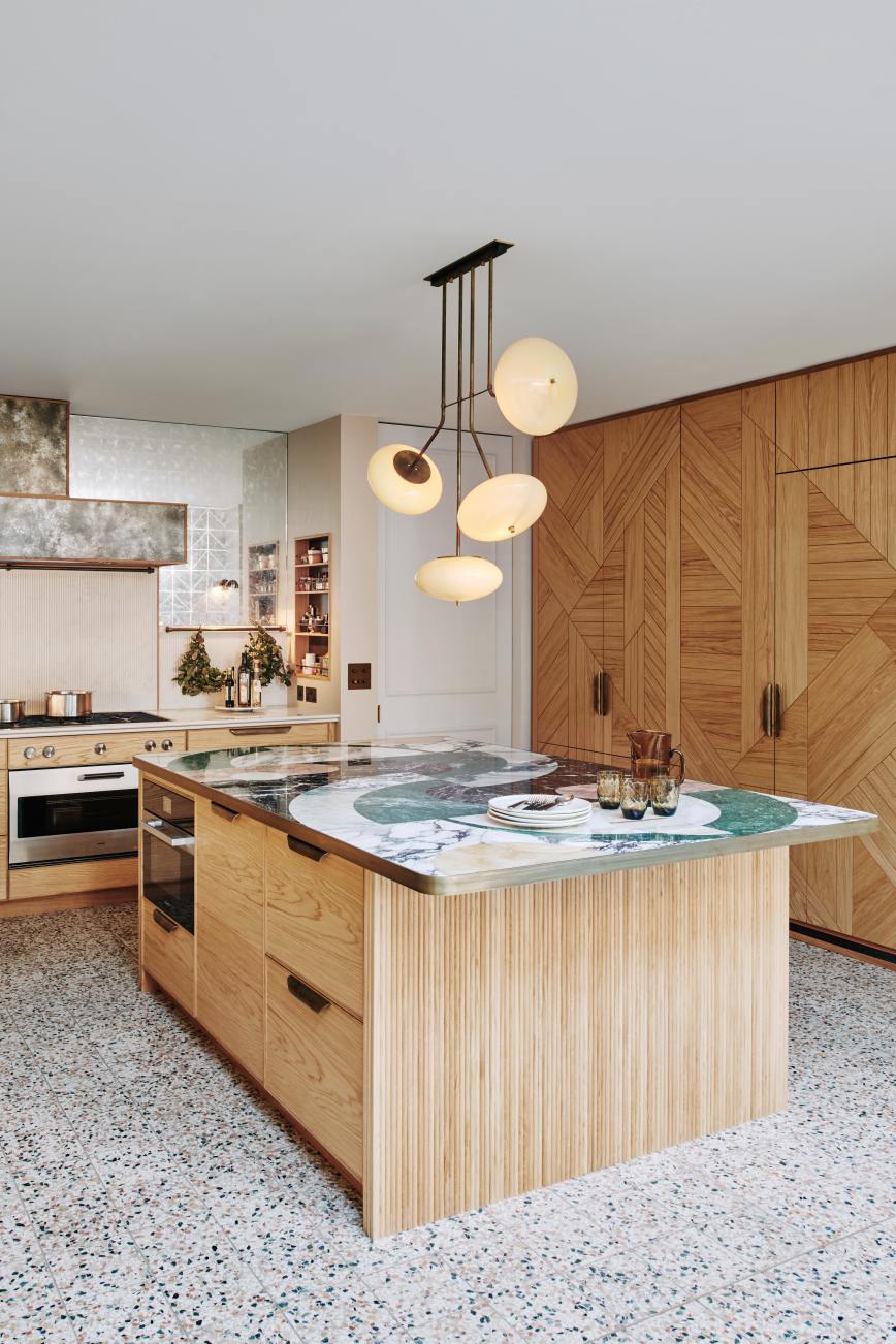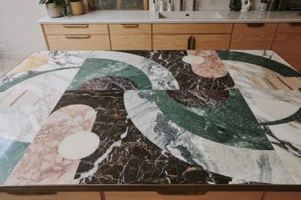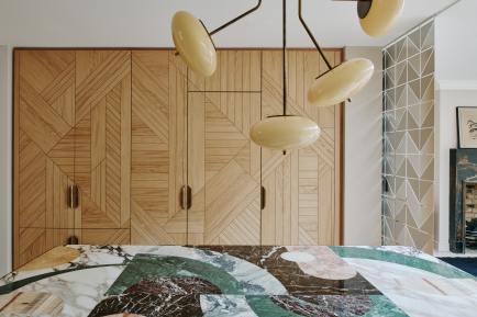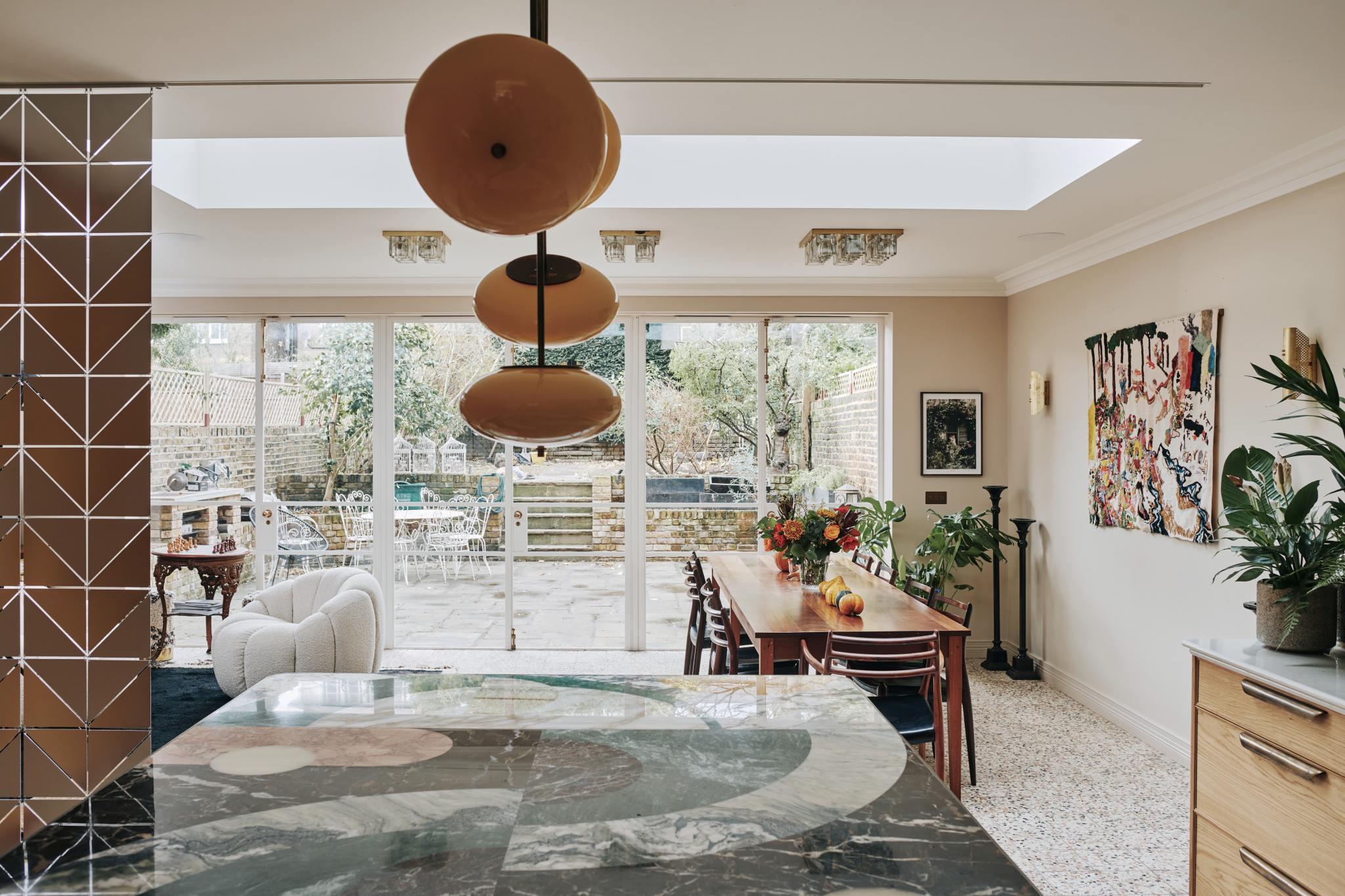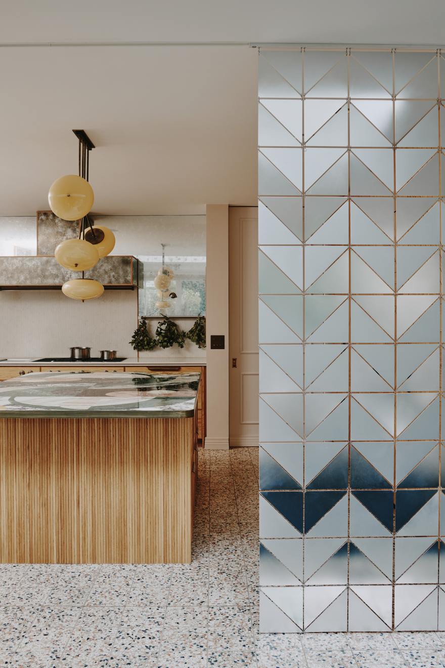A magnificent Italian marble design was specially commissioned for the island worktop which is a work of art in itself, and beautifully compliments the muted colours in the rest of the kitchen. Finally as our client does a lot of entertaining, she wanted a screen she could pull across which would divide the dining area from the kitchen when required. Inspired by a retro 70’s design our client found in an antiques shop, Charlie designed a screen made from brushed and polished stainless steel to highlight the geometric pattern, the final eclectic touch to this beautiful kitchen.