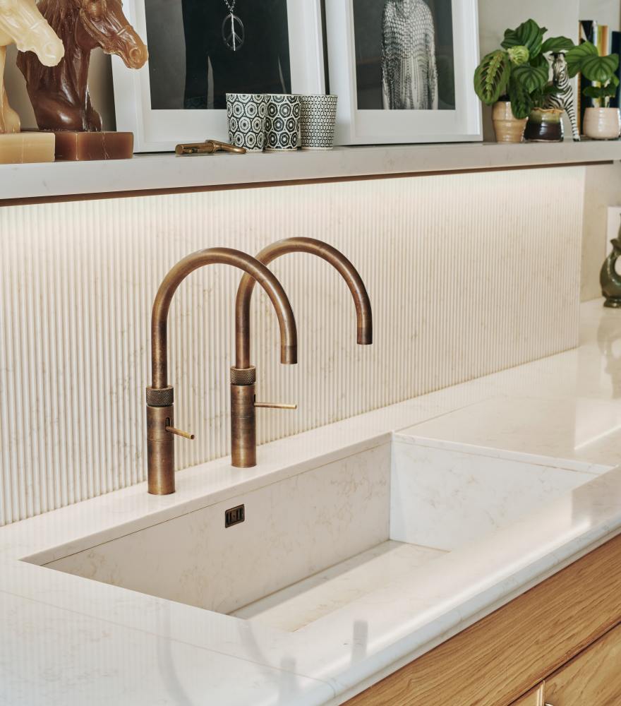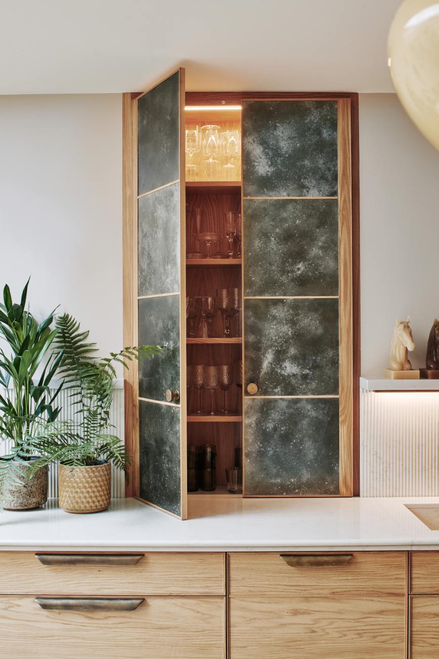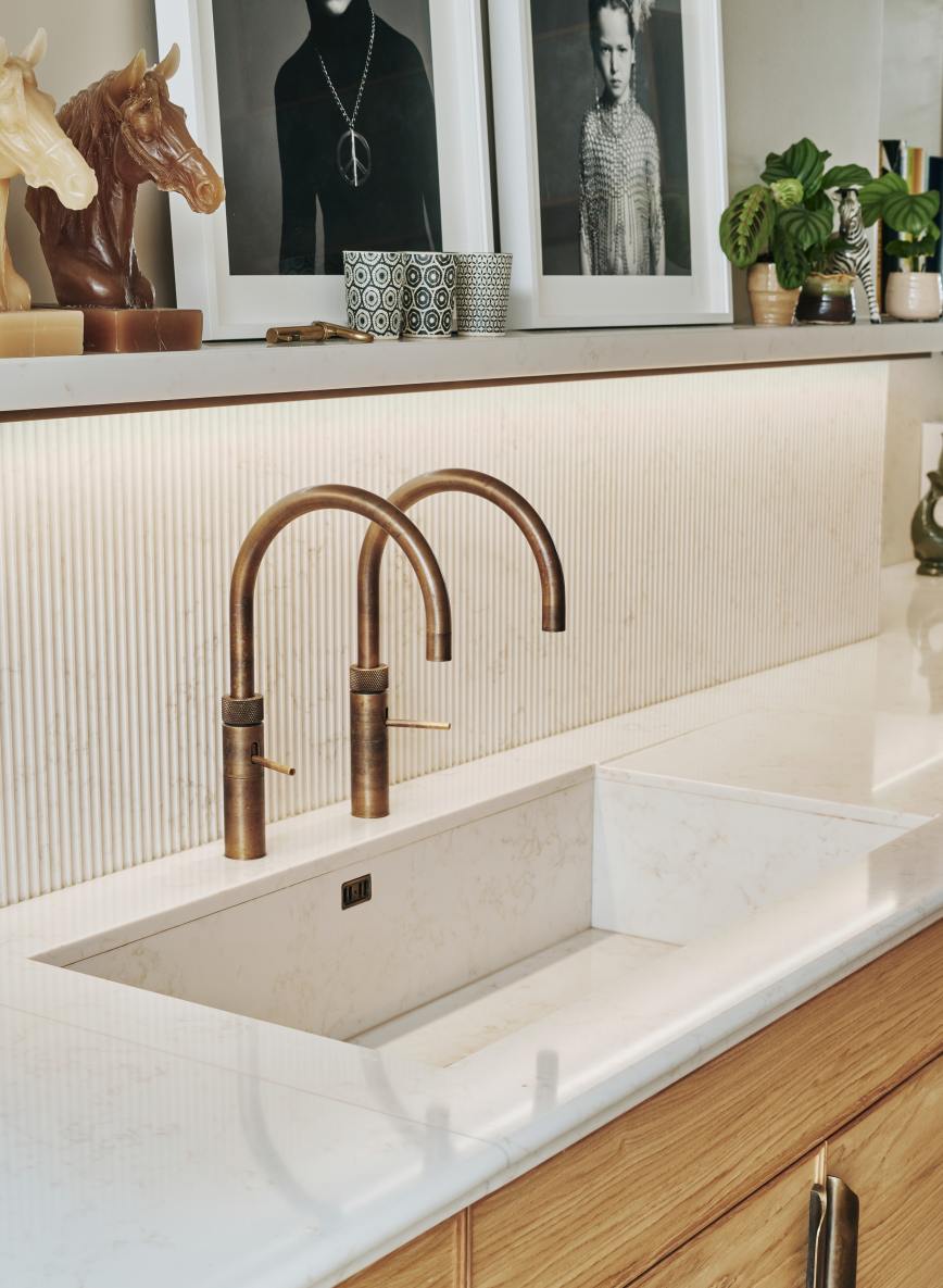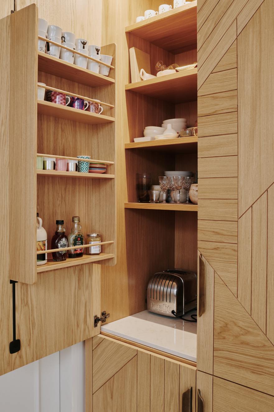 Made from natural oak with patinated zinc highlights, the kitchen has a strong contemporary feel which is combined with artisan craftsmanship, exemplified by the magnificent panelled design on the run of oak cupboards concealing the fridge, freezer and larder areas. Exquisite detailing is shown on the sides of the island which are made from fluted oak, and the Ambra Quartz splashback which has been similarly fluted to match.