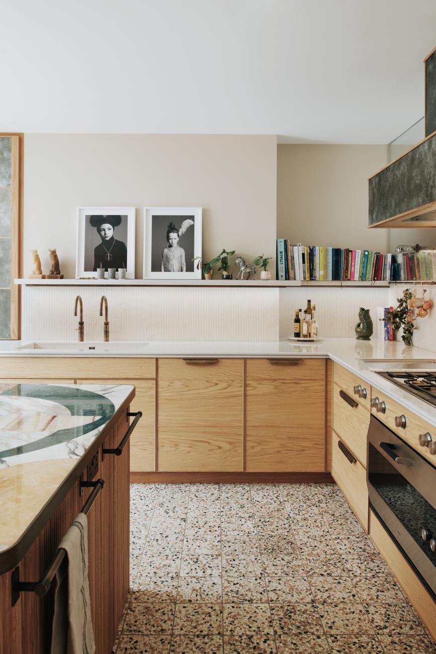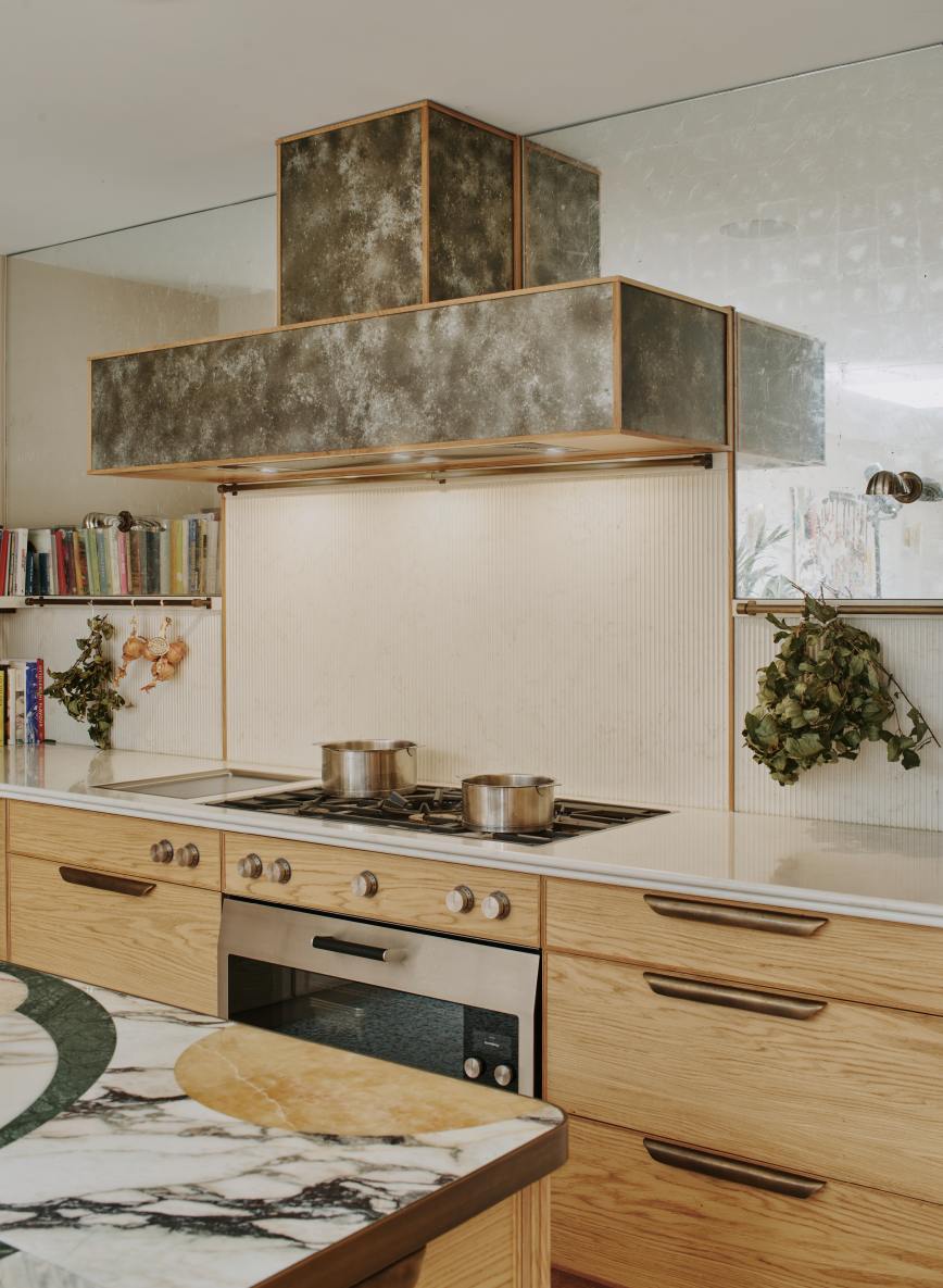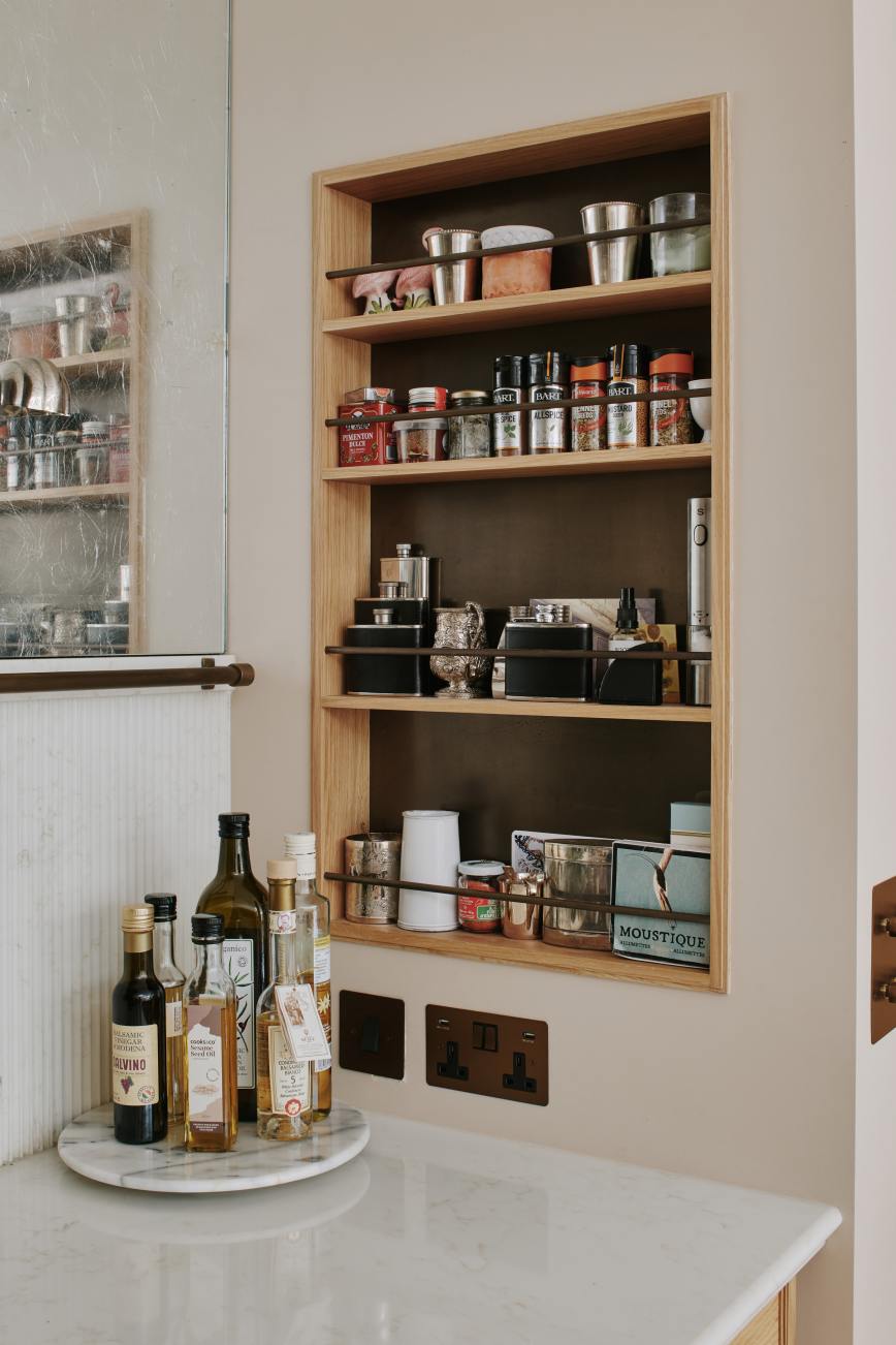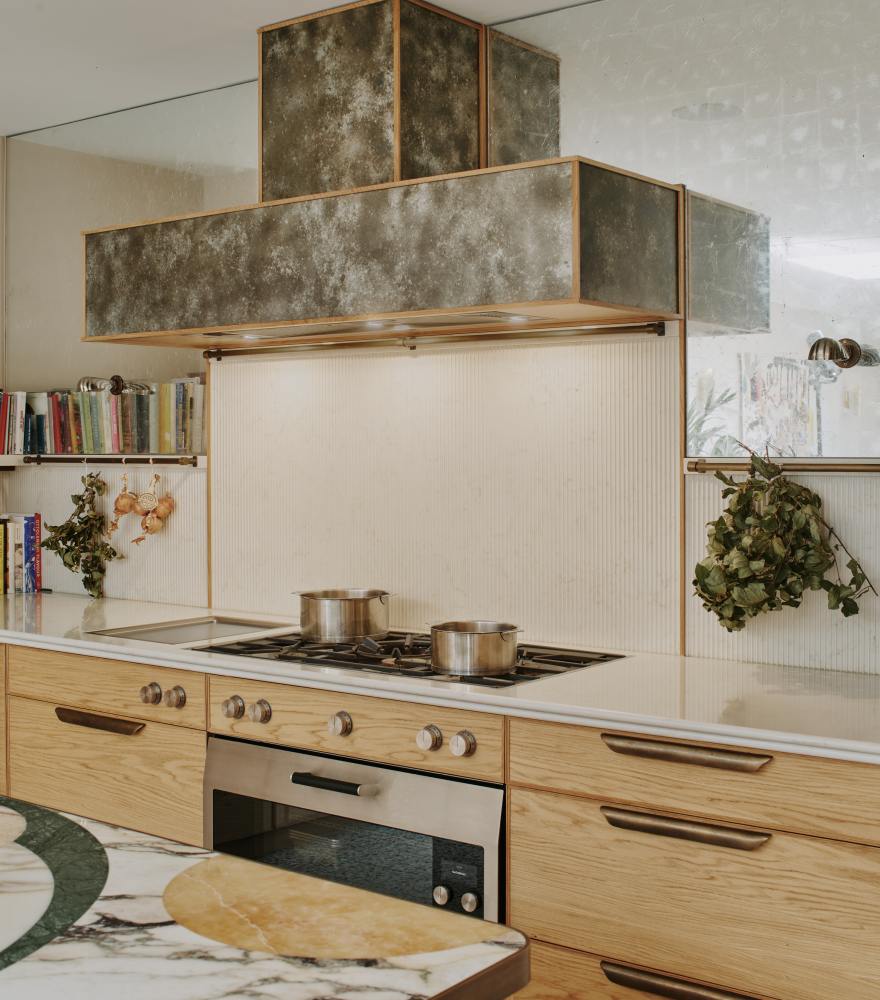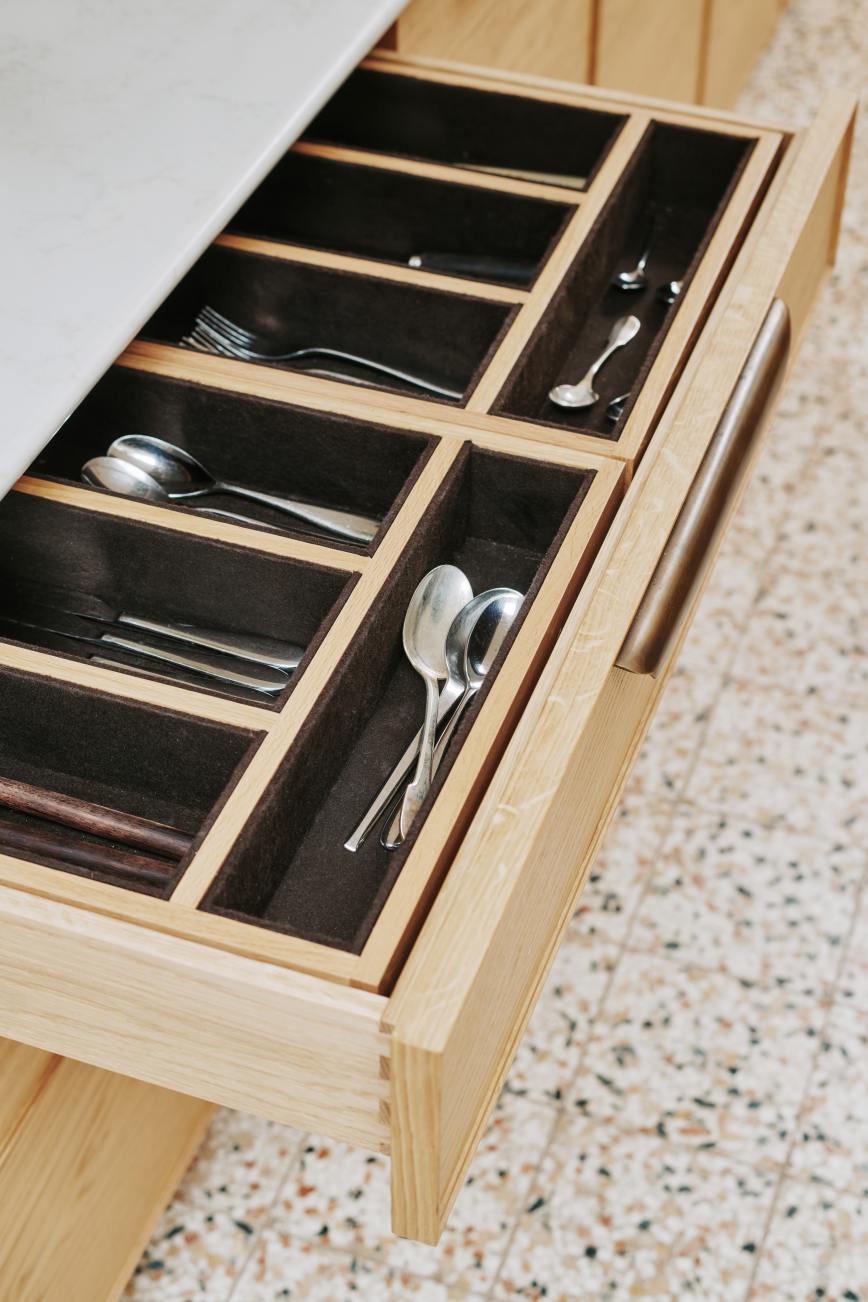 Made from natural oak with patinated zinc highlights, the kitchen has a strong contemporary feel which is combined with artisan craftsmanship, exemplified by the magnificent panelled design on the run of oak cupboards concealing the fridge, freezer and larder areas. Exquisite detailing is shown on the sides of the island which are made from fluted oak, and the Ambra Quartz splashback which has been similarly fluted to match.