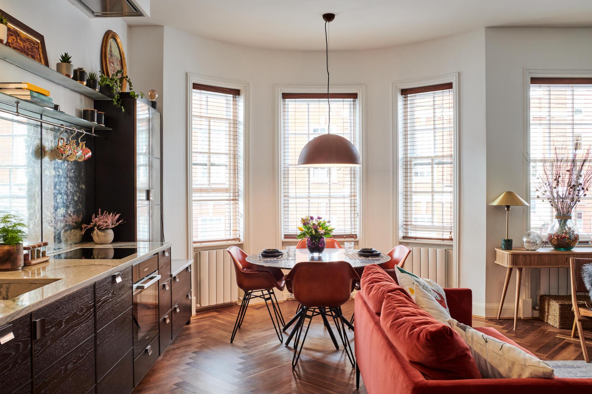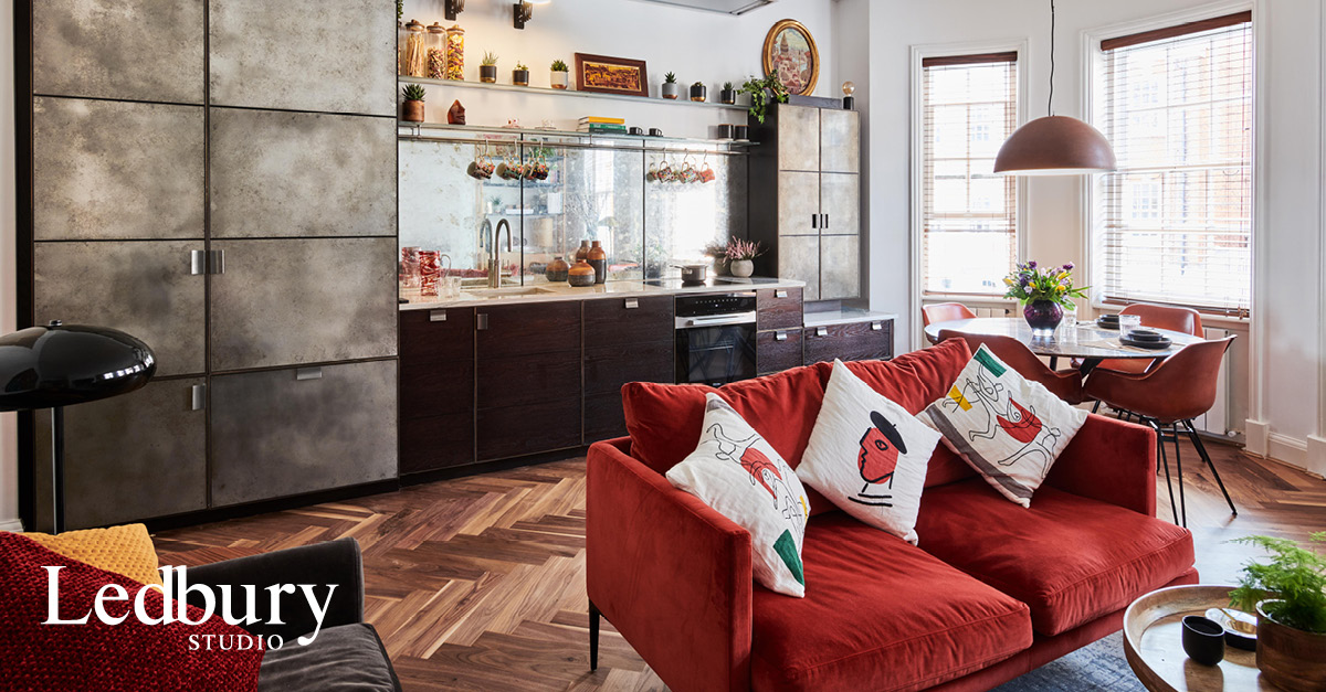 This Chelsea pied à terre is a masterclass in open-plan living. Despite the room’s relatively compact proportions ( 5m x 7m ), the homeowners needed the space to work for cooking, eating and living. They came to Ledbury Studio for a kitchen that would both furnish the space and enhance the overall look of the open-plan room.