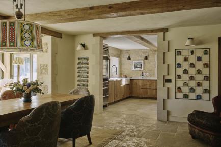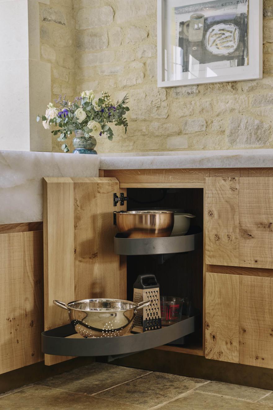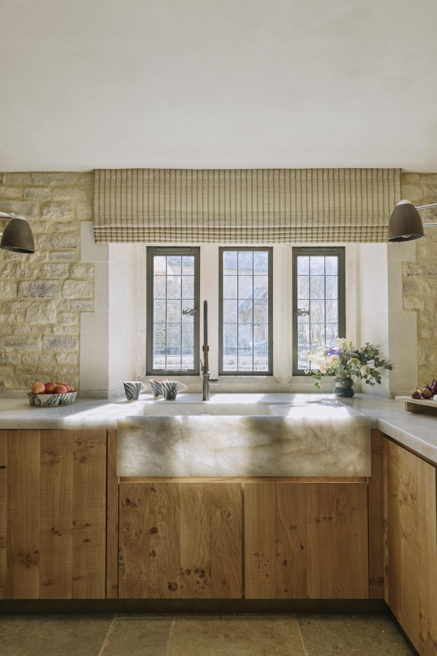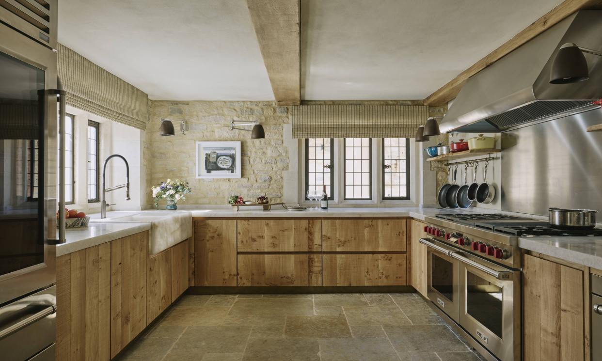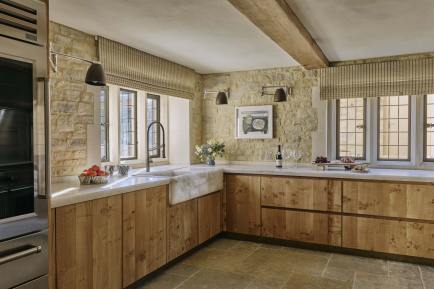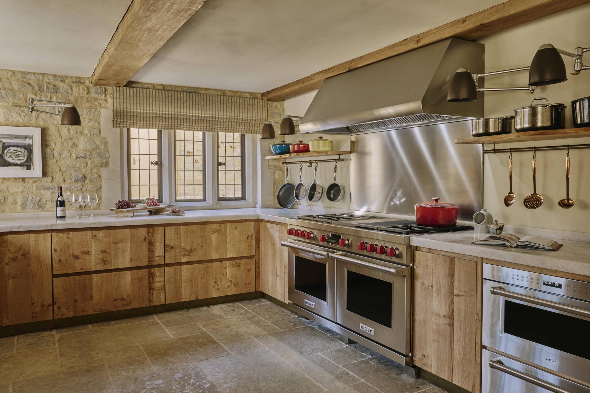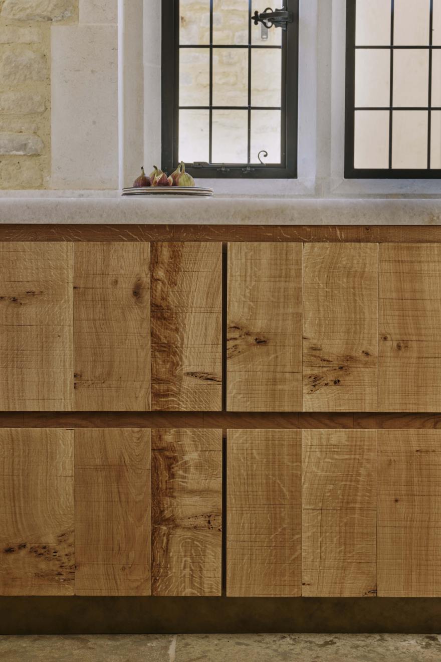 Our client worked with Sophie Ashby of Studio Ashby on this four year project to completely refurbish her beautiful country house in the Cotswolds. They wanted the open plan kitchen, dining and living space to retain a rustic vibe whilst using contrasting textures, shapes and materials to create a space that is both comfortable and inviting. Planks of textured crown oak were chosen for the kitchen acting as a complete contrast to the industrial looking stainless steel appliances “ a playful juxtaposition putting opposites side by side “ writes Sophie. Diamond quartzite adorns the worktops in another mix of materials, and is also used for the large sink which captures the sunlight from the garden. The base cupboards are handleless adding a contemporary touch, leaving nothing to distract from the beauty of the grain of the wood.