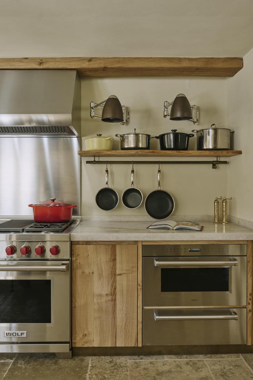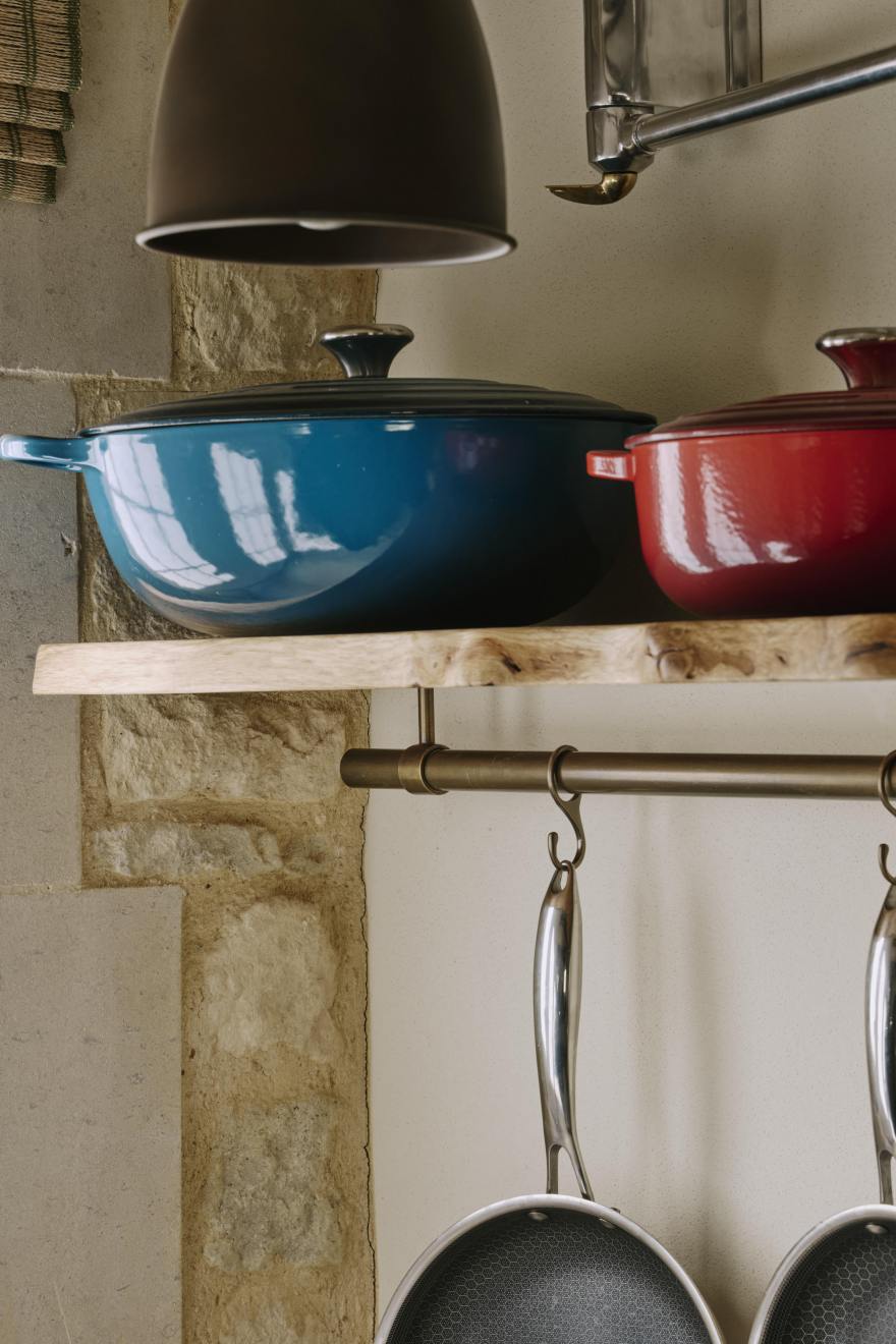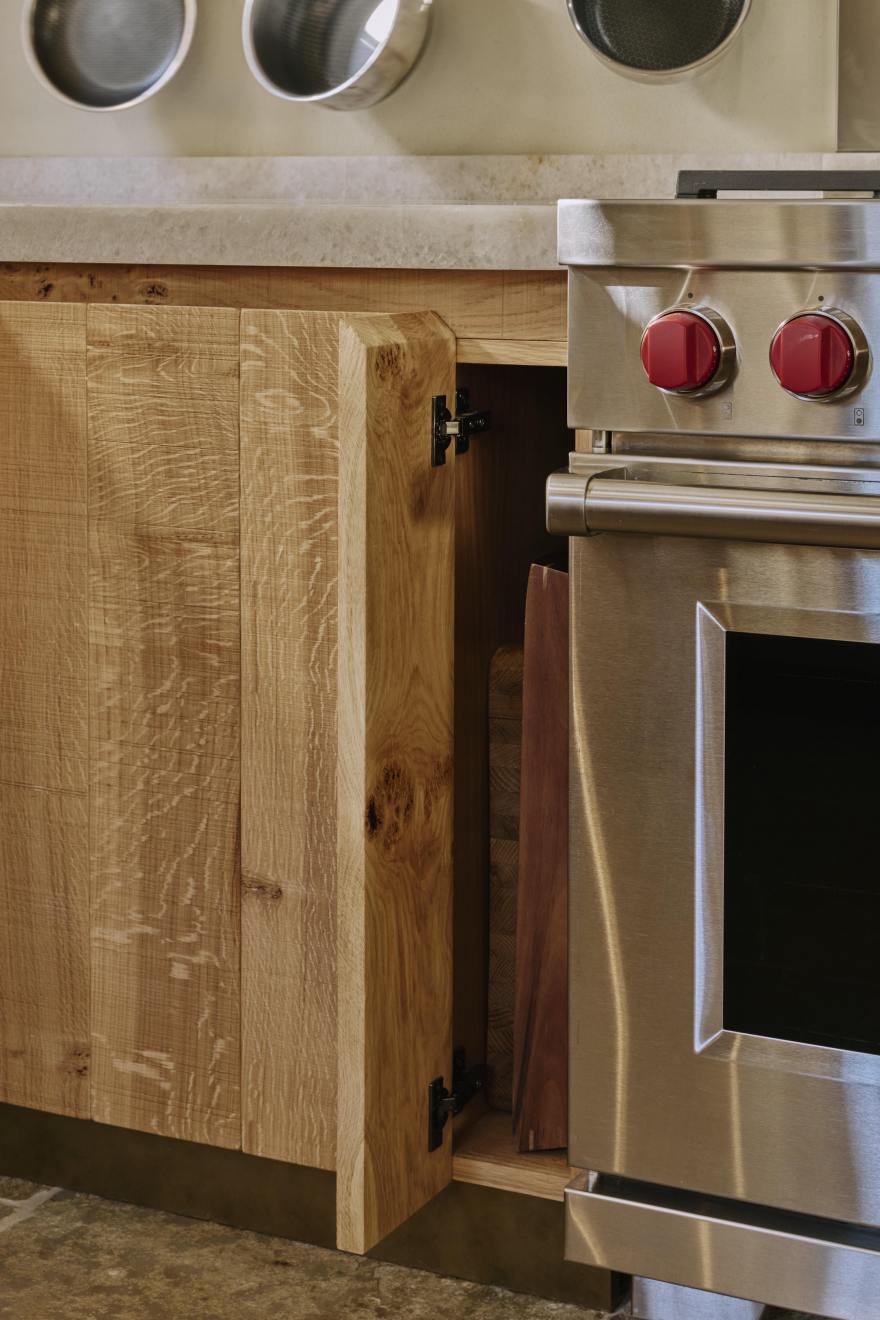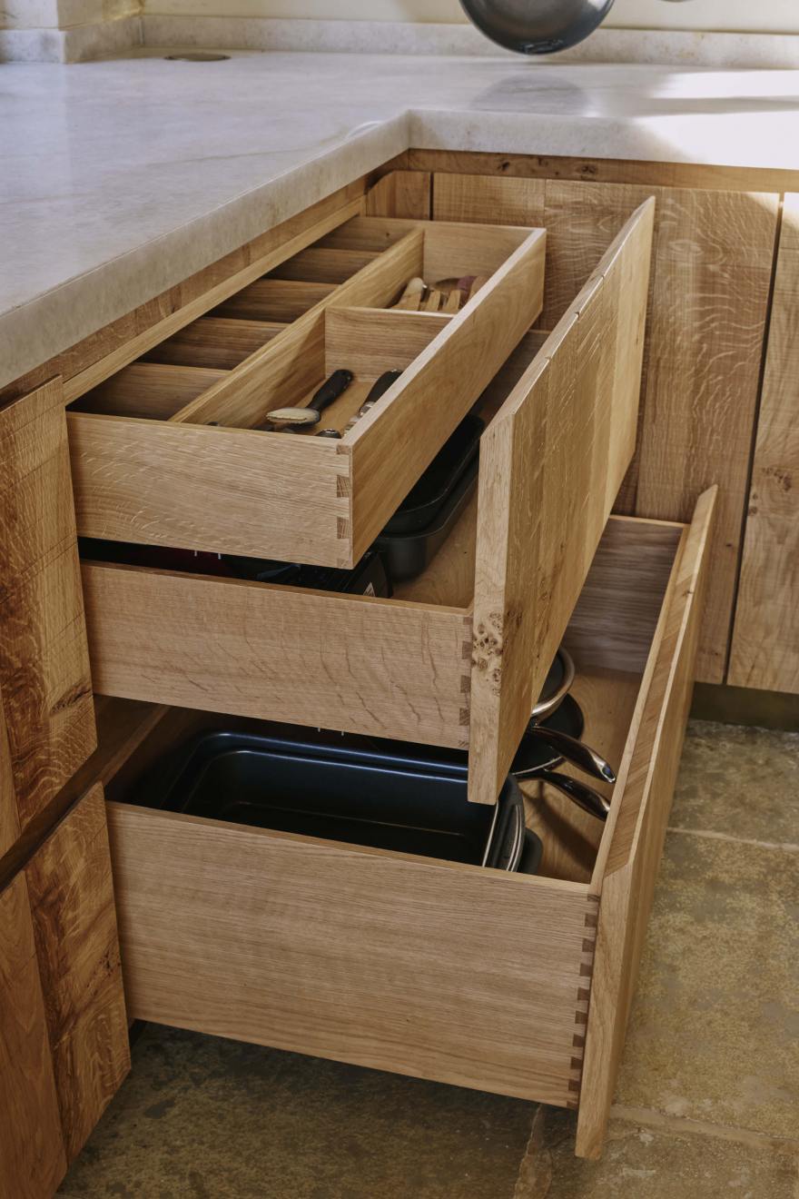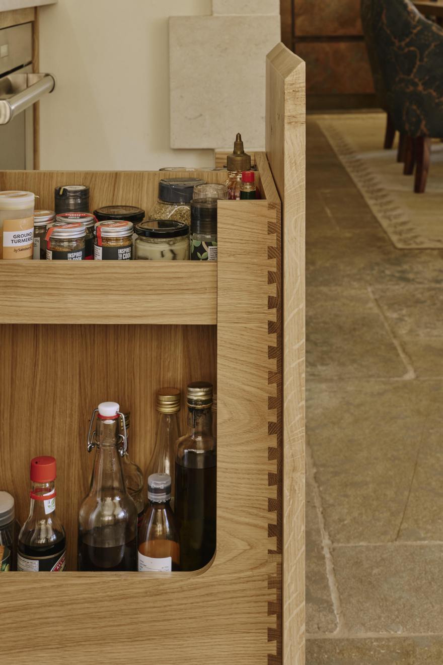 Our client worked with Sophie Ashby of Studio Ashby on this four year project to completely refurbish her beautiful country house in the Cotswolds. They wanted the open plan kitchen, dining and living space to retain a rustic vibe whilst using contrasting textures, shapes and materials to create a space that is both comfortable and inviting. Planks of textured crown oak were chosen for the kitchen acting as a complete contrast to the industrial looking stainless steel appliances “ a playful juxtaposition putting opposites side by side “ writes Sophie. Diamond quartzite adorns the worktops in another mix of materials, and is also used for the large sink which captures the sunlight from the garden. The base cupboards are handleless adding a contemporary touch, leaving nothing to distract from the beauty of the grain of the wood.