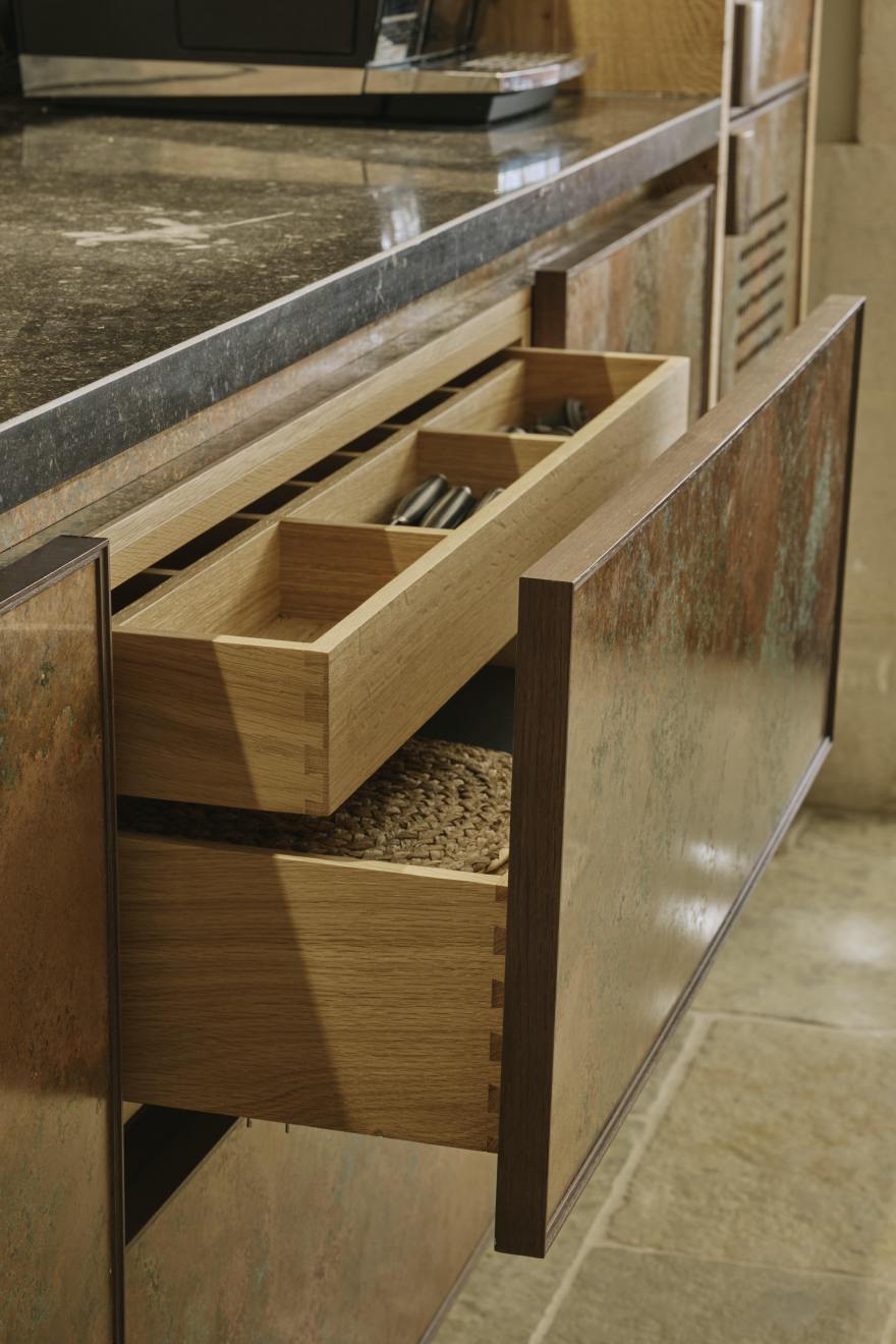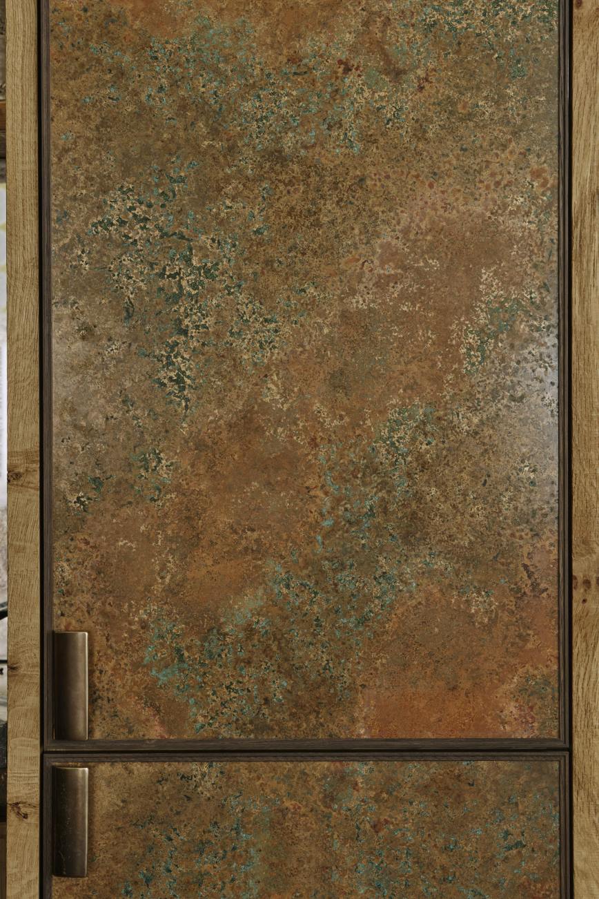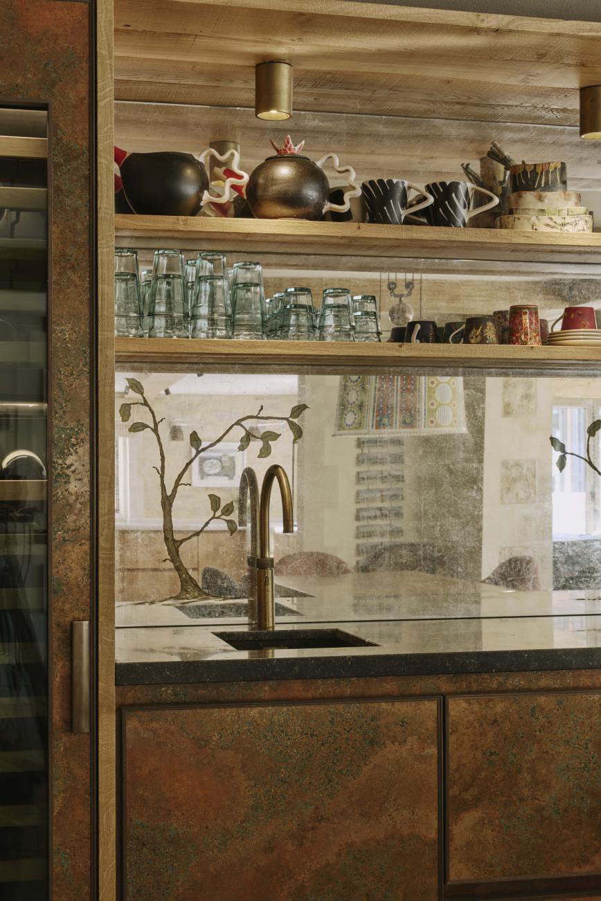 By contrast the large breakfast/ drinks cupboard in the dining area is made from solid sheets of patinated verdigris copper with a figured gold leaf eglomise mirrored back. A piece as practical as it is beautiful.