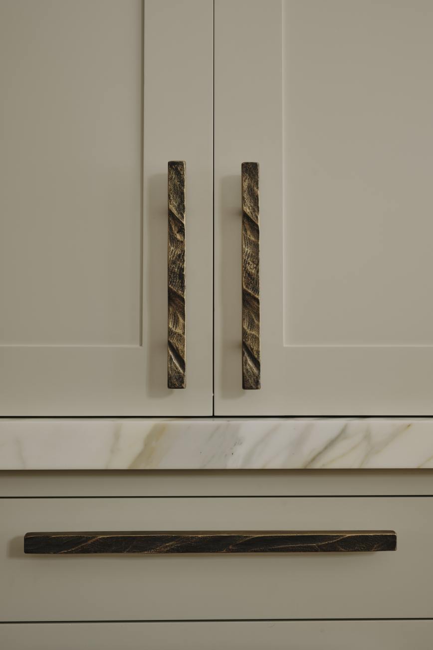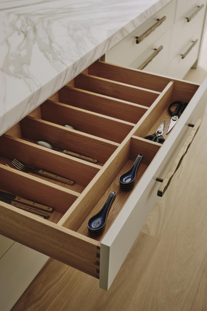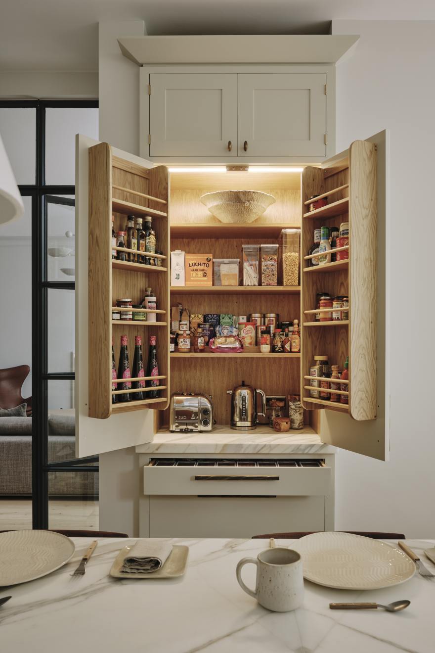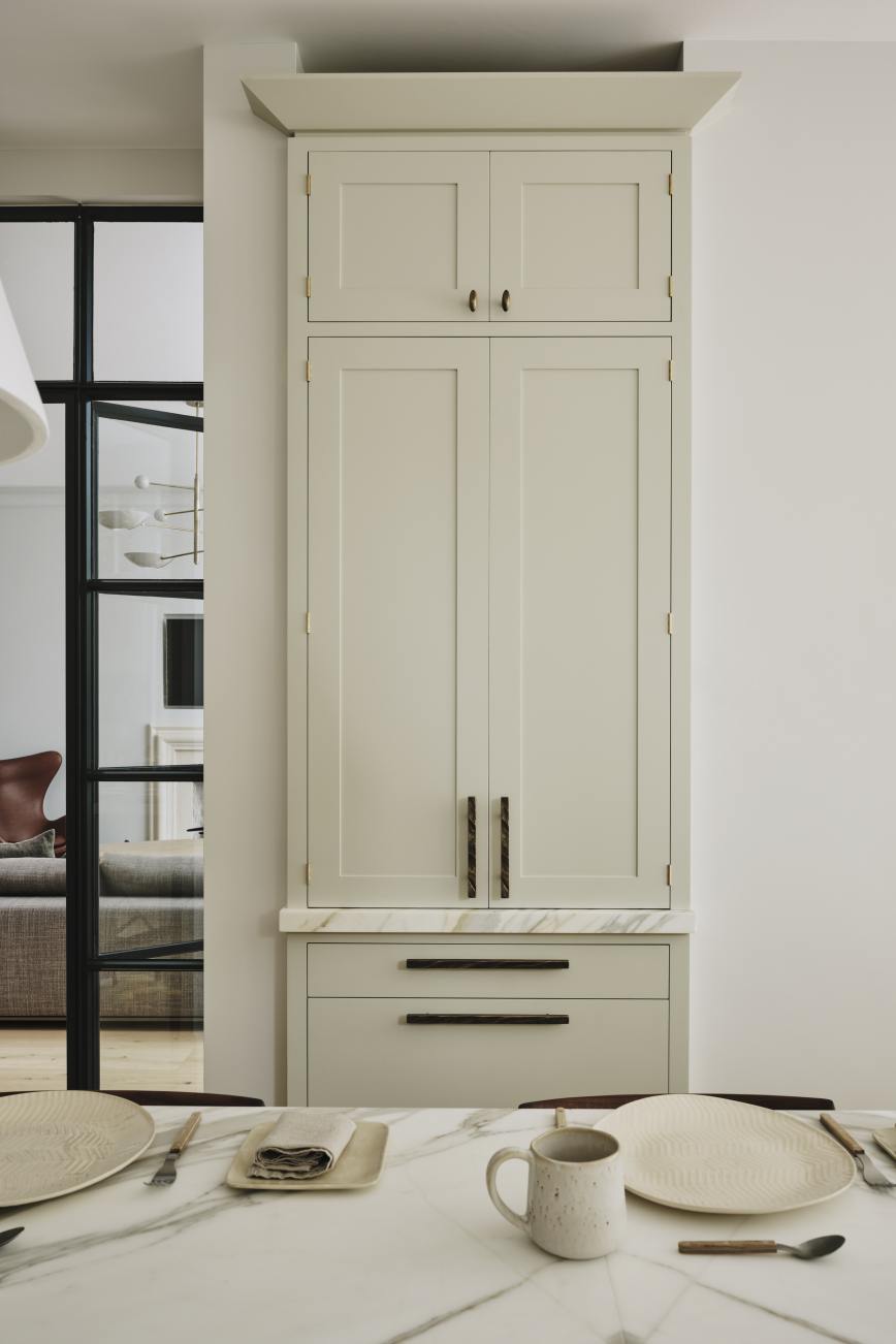Our client was undertaking a complete makeover of this elegant and spacious Edwardian house in Hampstead and wanted the kitchen to follow the contemporary but classic style of the rest of the house. Charlie designed a version of the Ledbury Shaker kitchen, bringing the style bang up to date with a modern cornice and specially designed aged brass handles. The colour palette is calm and muted in Shadow White , and there is a very serene feel to the kitchen with its beautifully made simple furniture. Storage and functionality were a priority so frame sizes on drawers were kept to a minimum to maximise cupboard space.