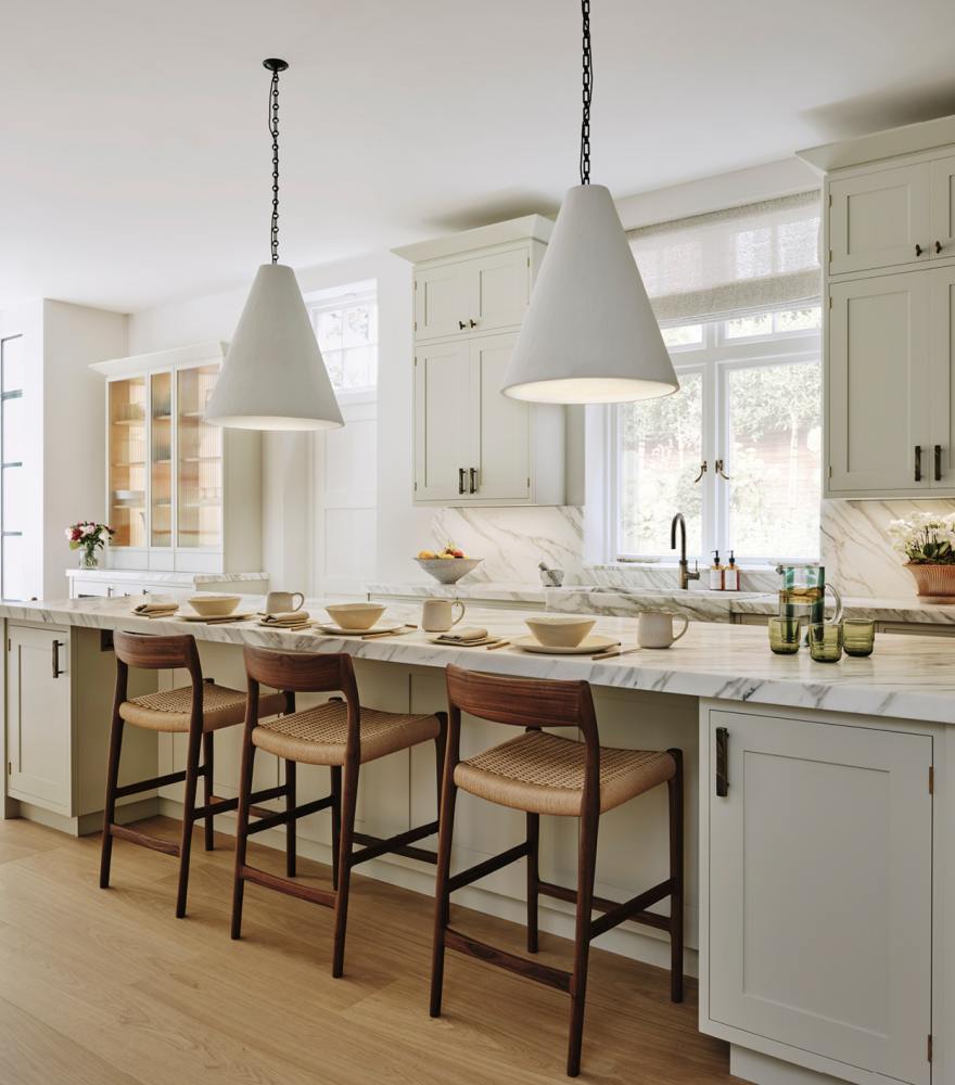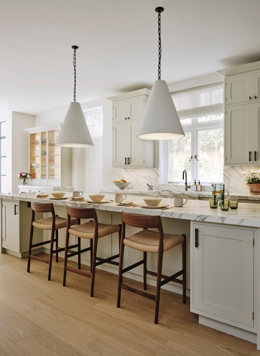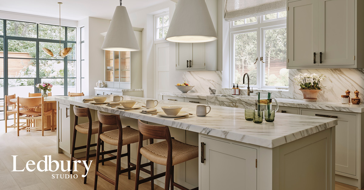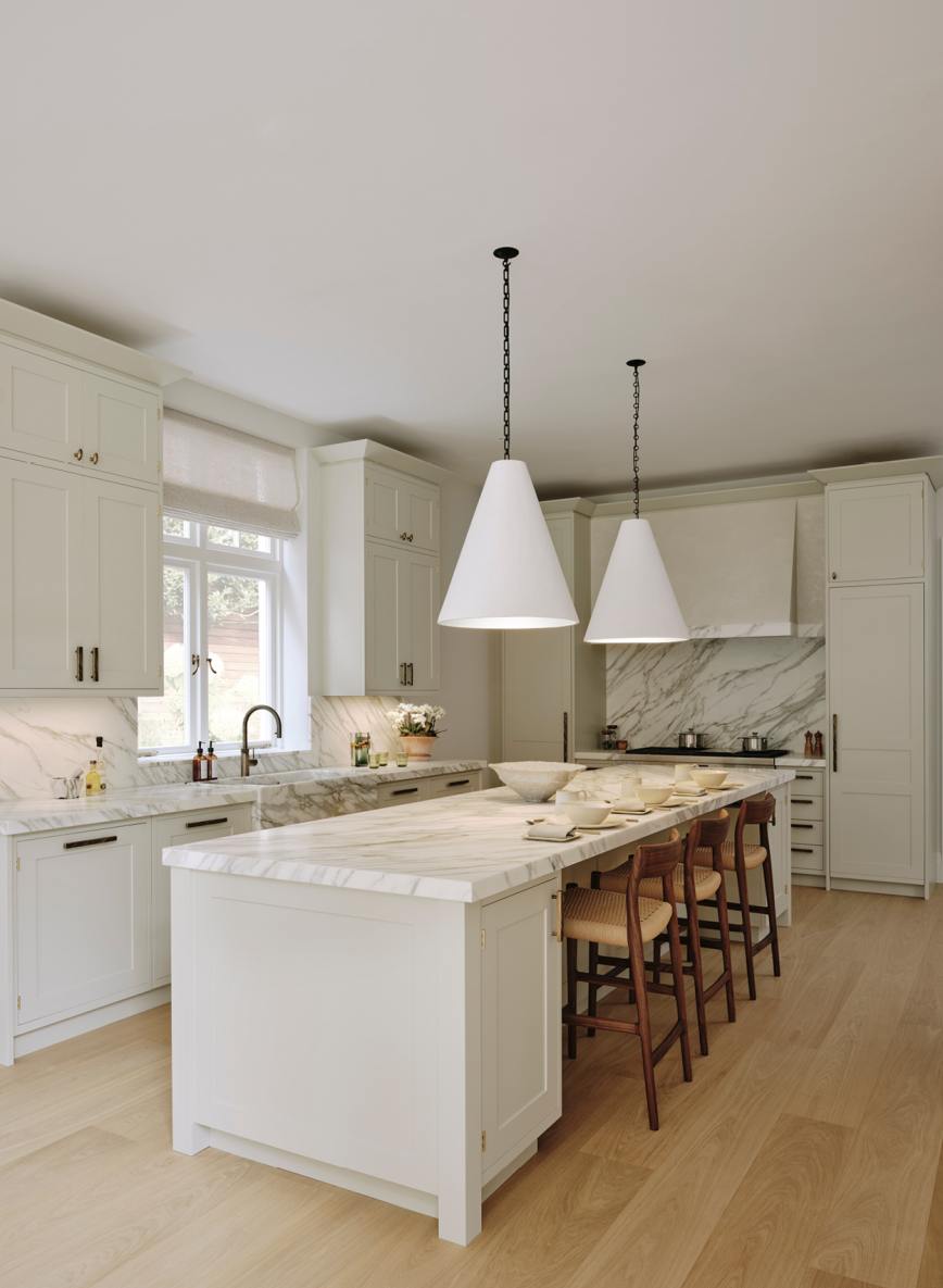 Our client was undertaking a complete makeover of this elegant and spacious Edwardian house in Hampstead and wanted the kitchen to follow the contemporary but classic style of the rest of the house. Charlie designed a version of the Ledbury Shaker kitchen, bringing the style bang up to date with a modern cornice and specially designed aged brass handles. The colour palette is calm and muted in Shadow White , and there is a very serene feel to the kitchen with its beautifully made simple furniture. Storage and functionality were a priority so frame sizes on drawers were kept to a minimum to maximise cupboard space.