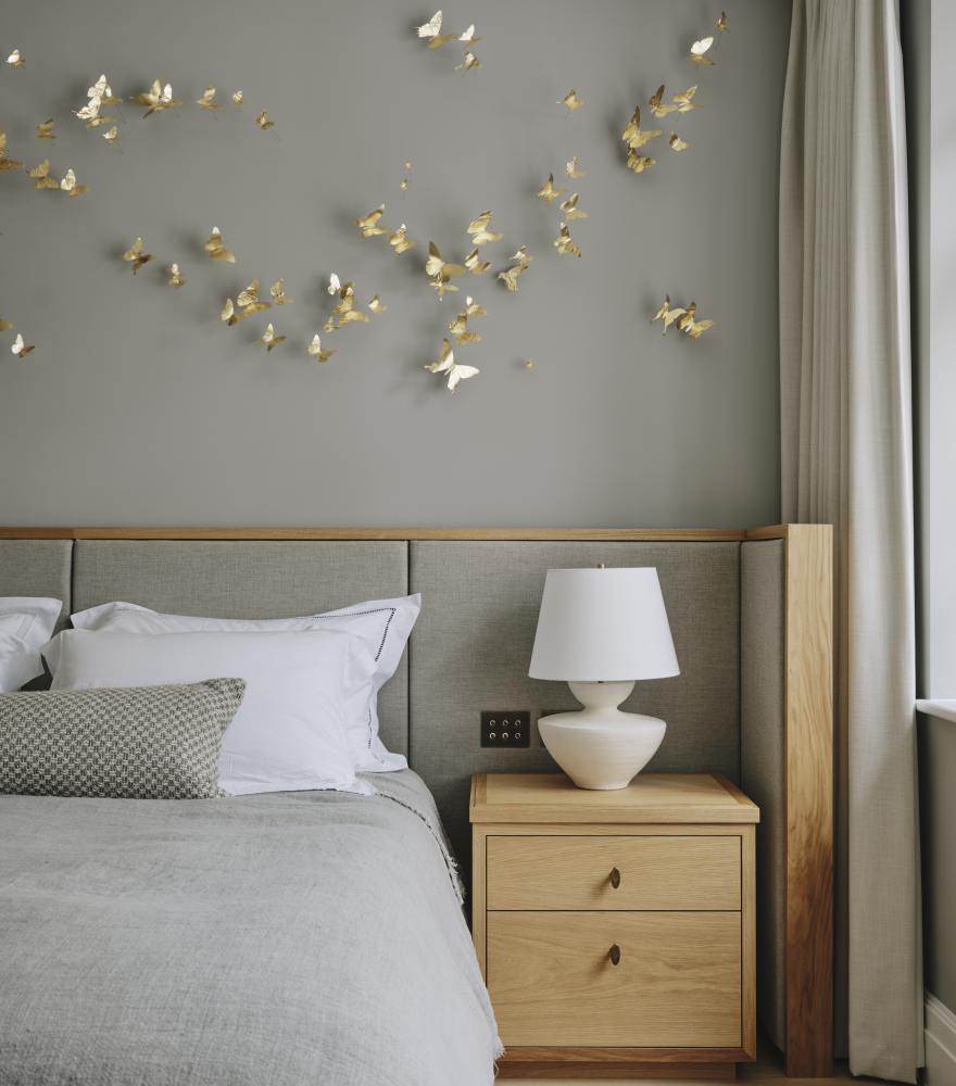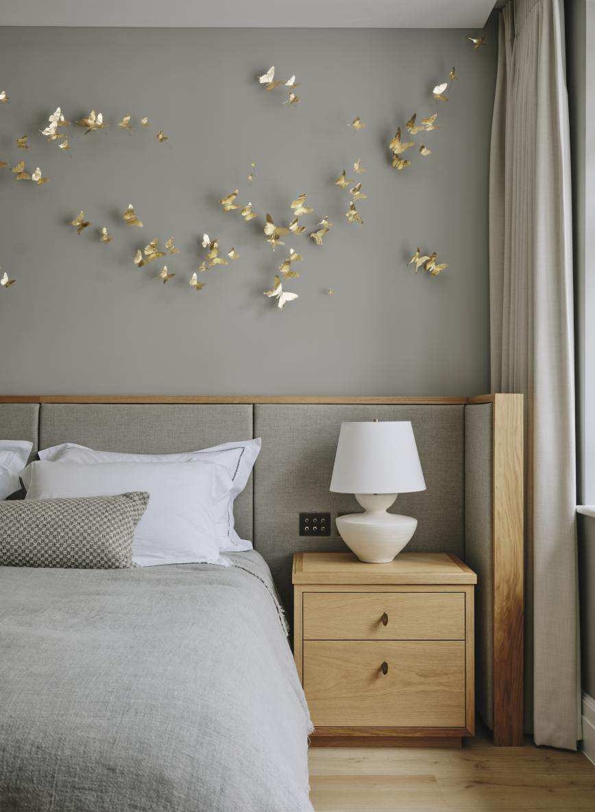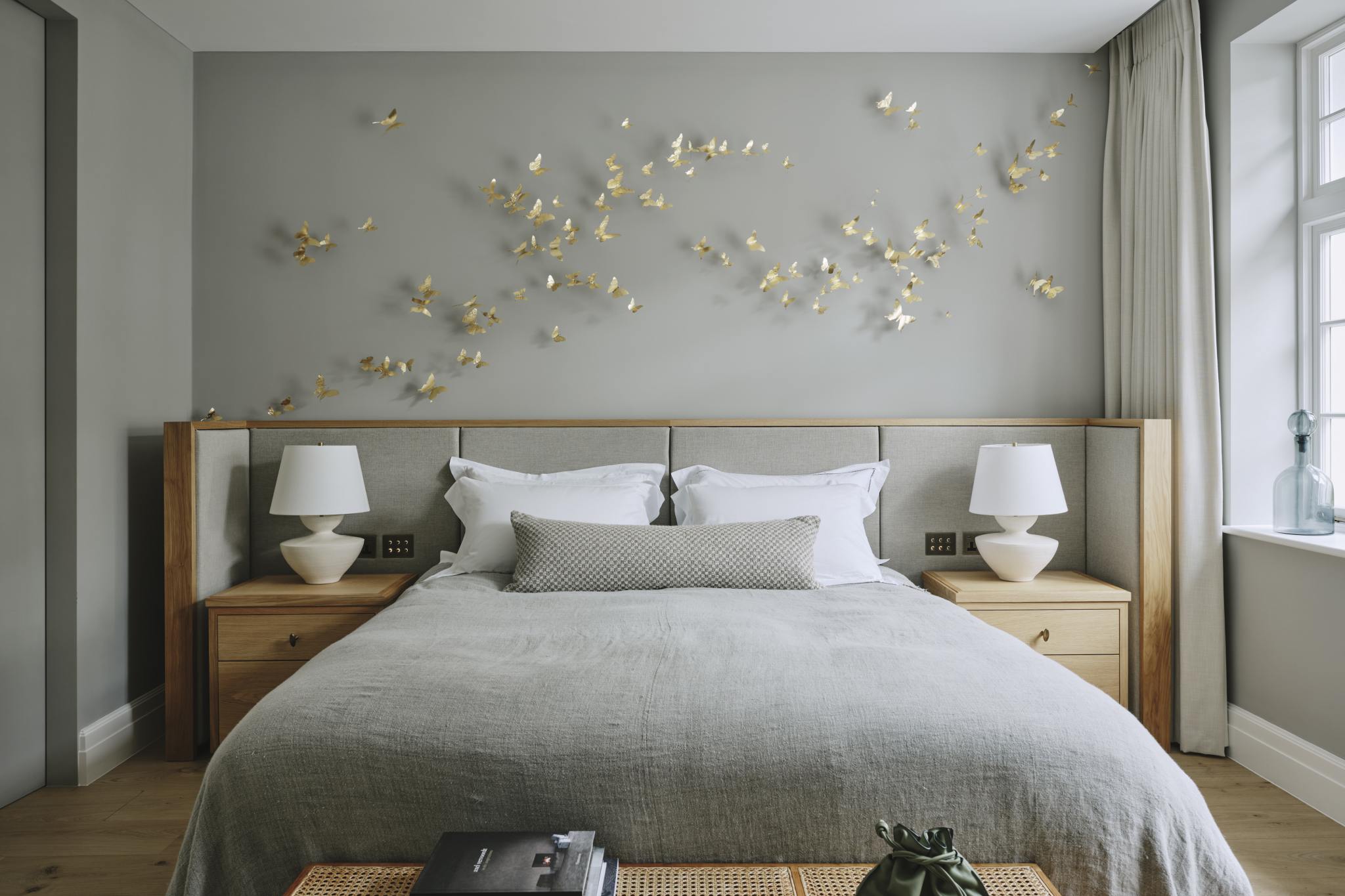 A beautiful upholstered headboard was designed in natural oak with bedside tables to match, in this calm and serene master bedroom.