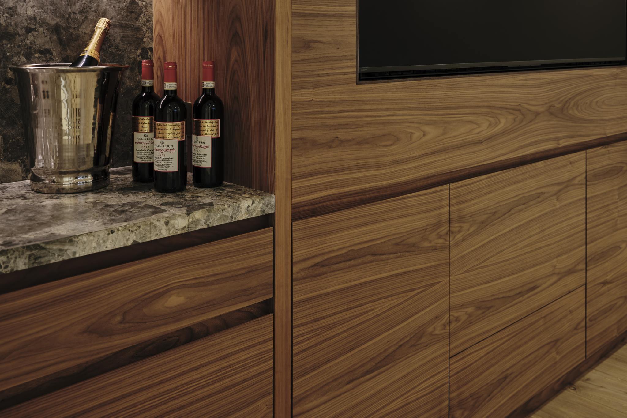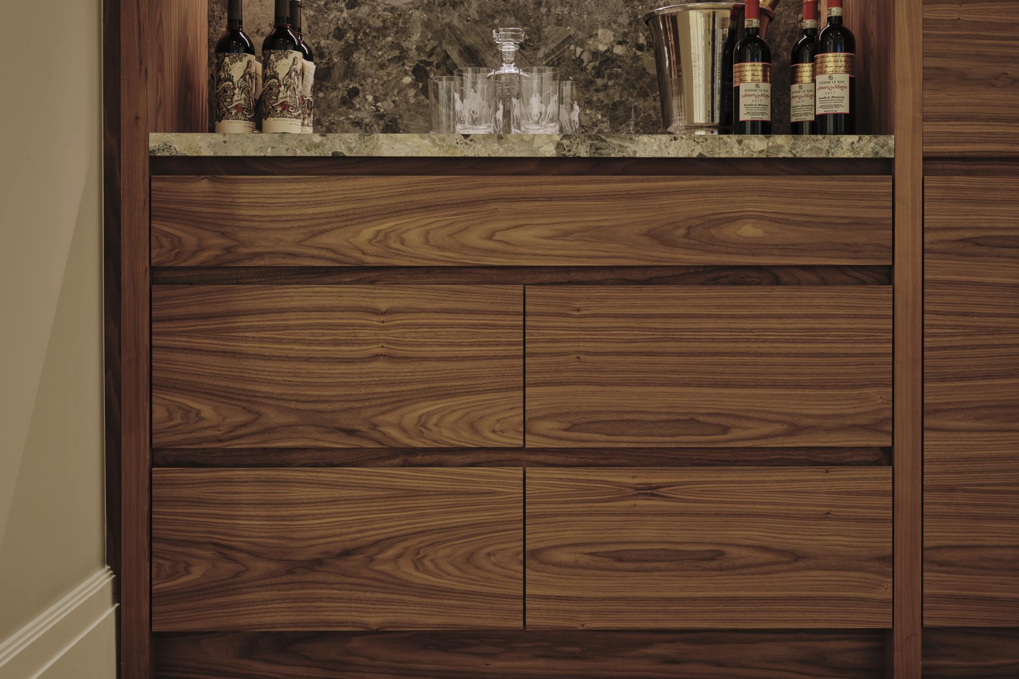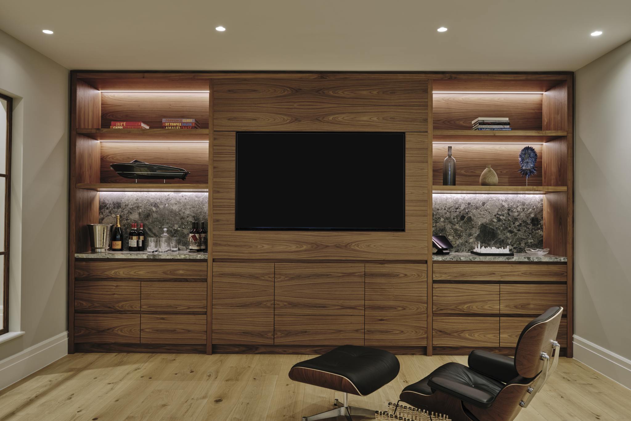 Bespoke media cupboards are becoming more and more a feature of our designs. Here bookmatched walnut veneer was used in this cabinet stretching the width of the room, and specially designed to house a drinks cabinet, TV and sound system, with shelves for display ad storage.