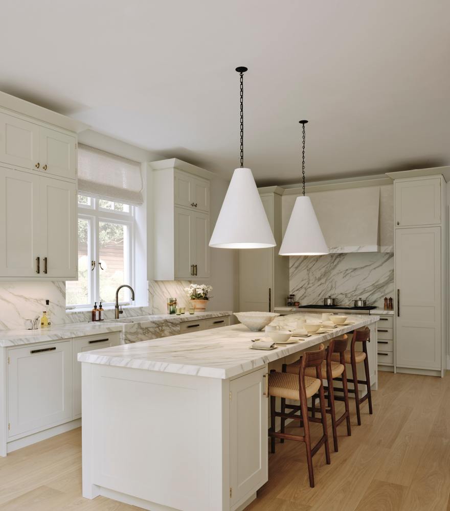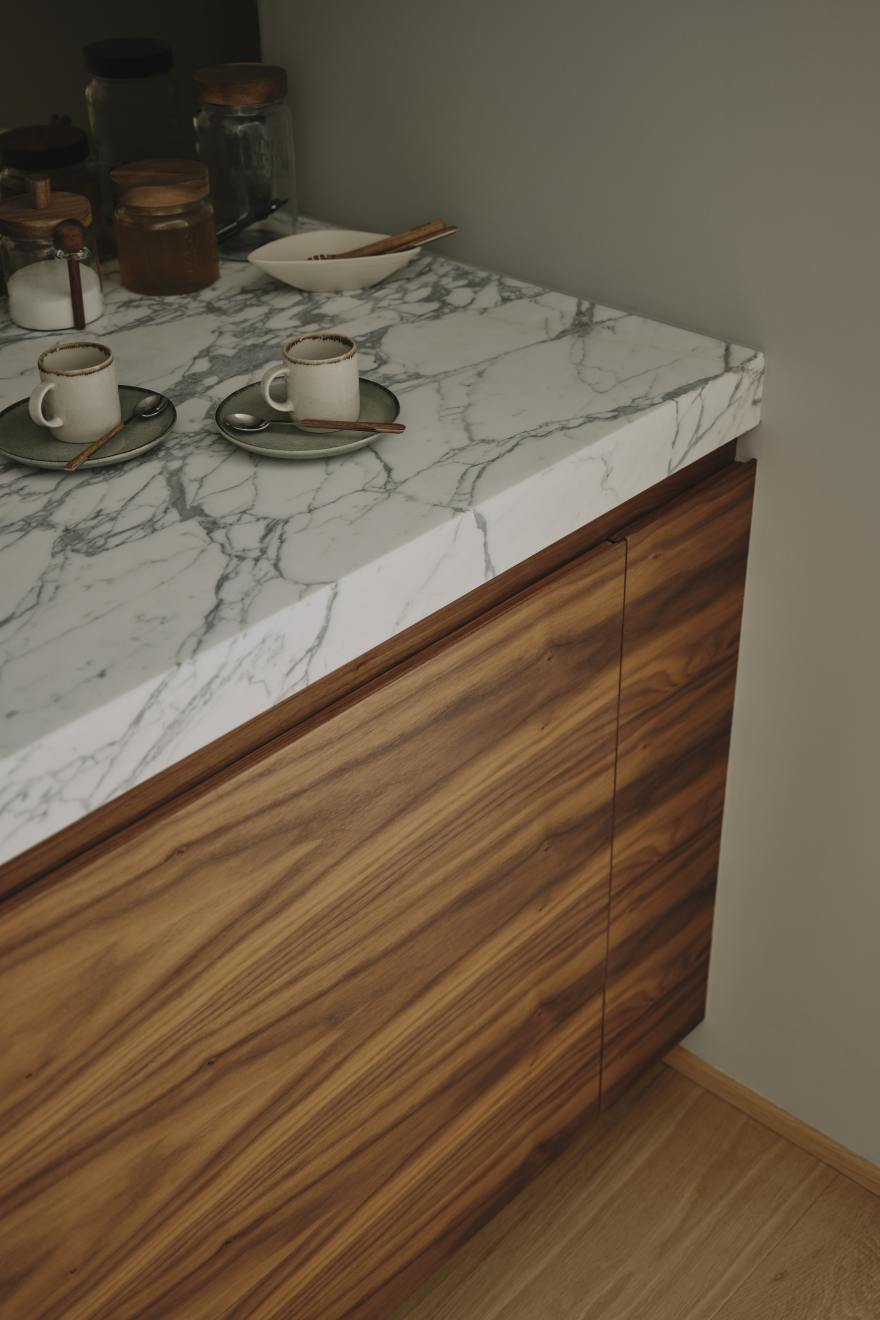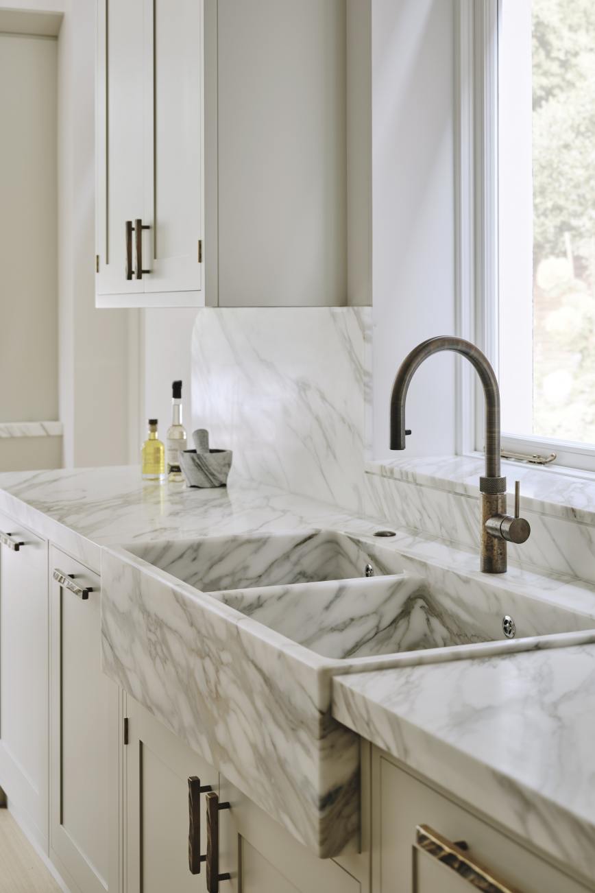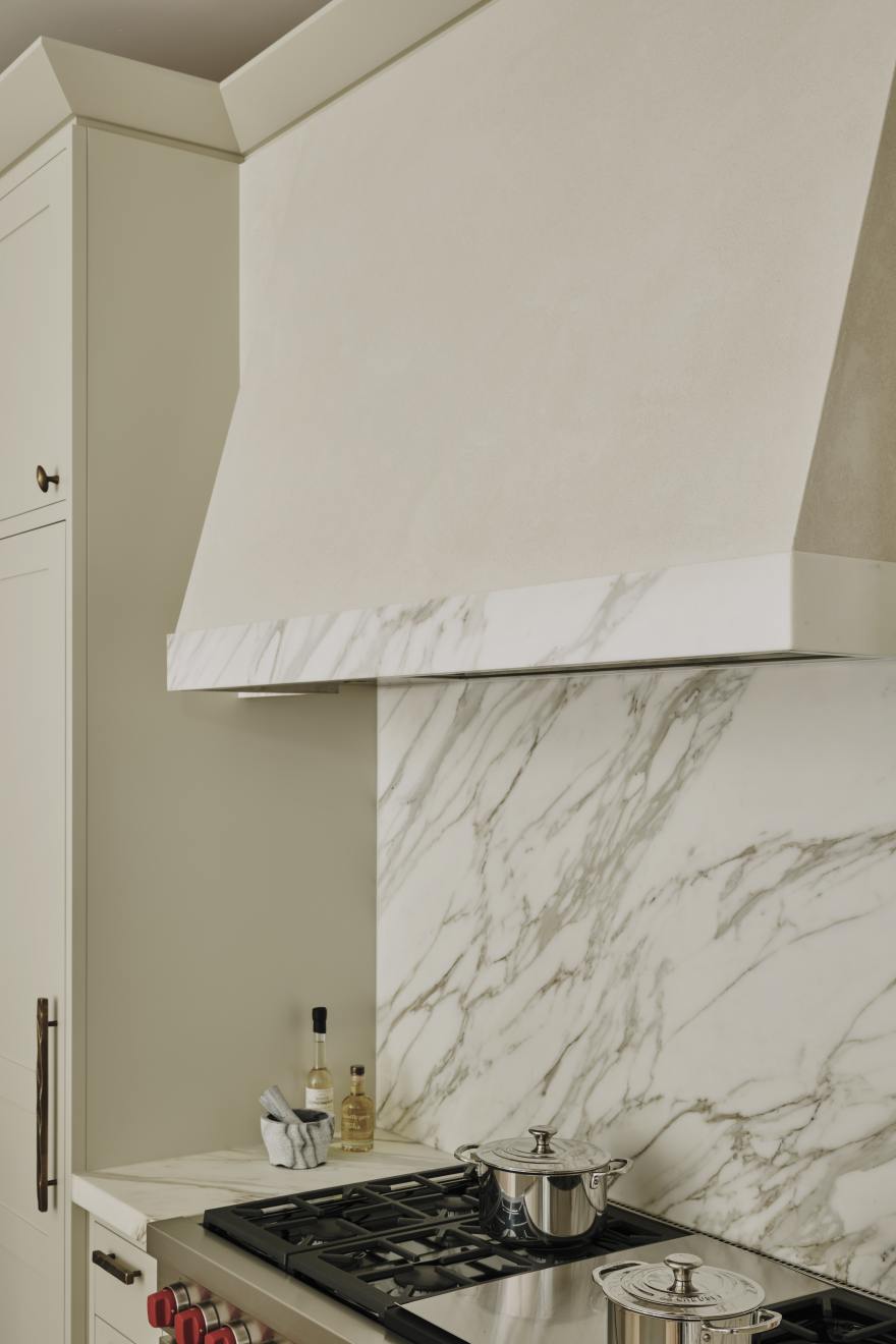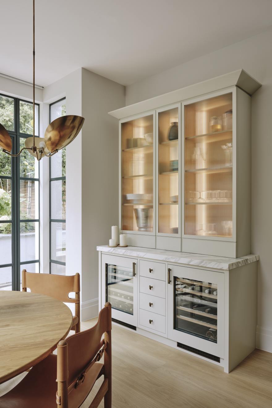 The use of luxurious materials in an understated way is the hallmark of this kitchen, so above the Wolf range is a cooker hood made with a textured Marmarino Venetian Plaster finish, and the beautiful bespoke double sink in Arabescato marble was specially designed to sit within the marble worktop. Ribbed glass was used in the drinks cabinet by the table and elsewhere to add to the modern touch in the rest of the kitchen.