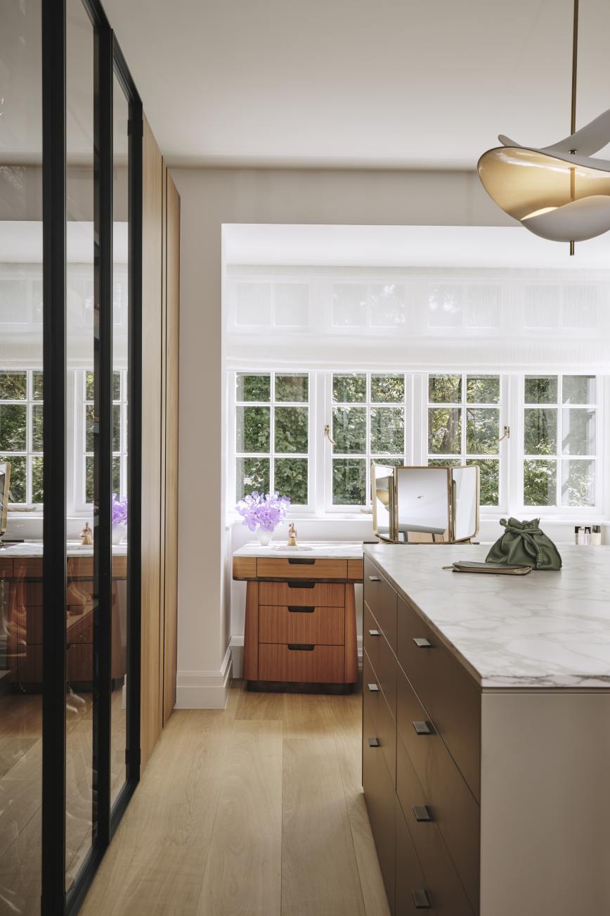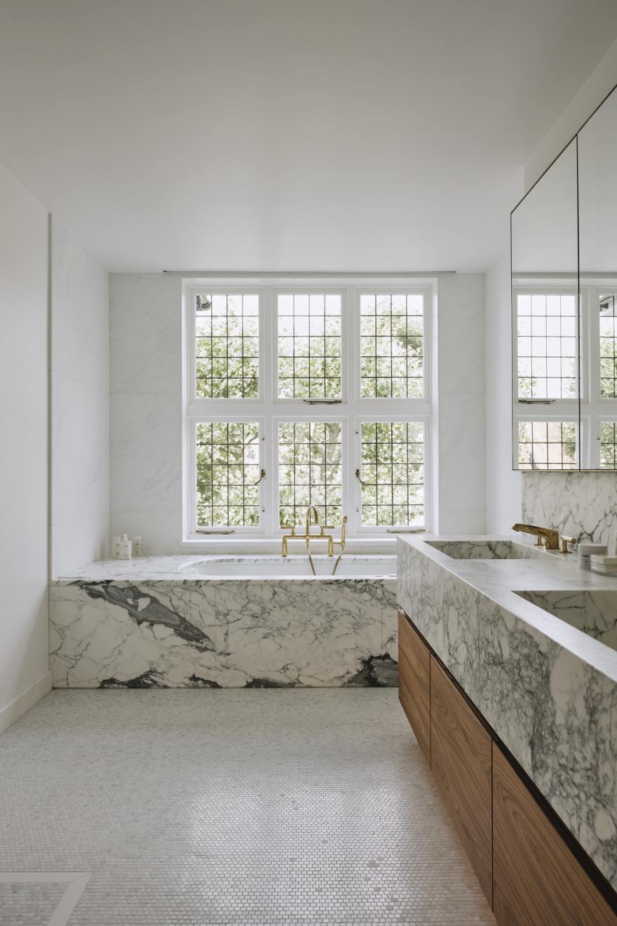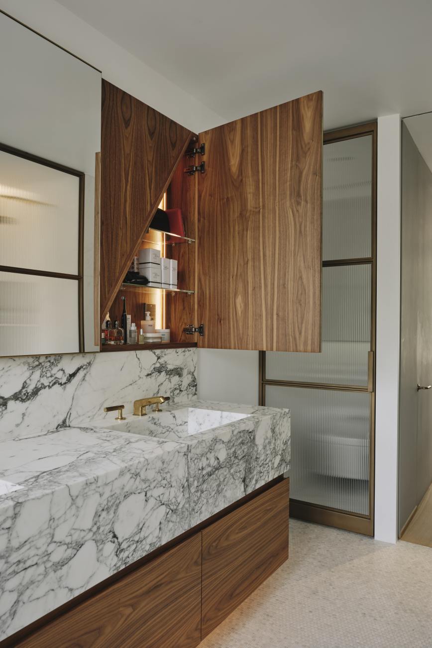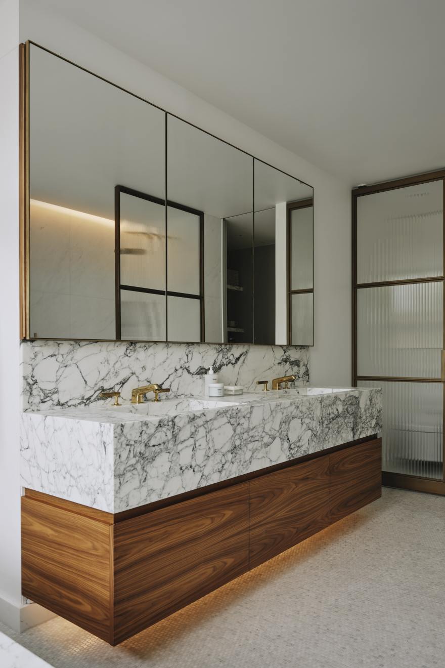 Walnut veneer continues the theme into the master bathroom for the vanities, with bespoke mirrored storage cupboards above , and walnut interiors specially crafted around a chimney brest to maximise storage space. Fabulous arabescato marble was used throughout for the bath surround , vanity tops and shower giving this dream bathroom the wow factor!