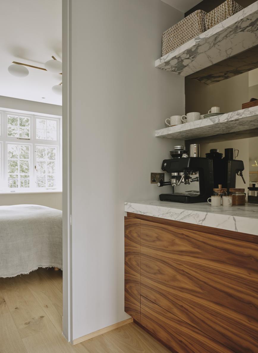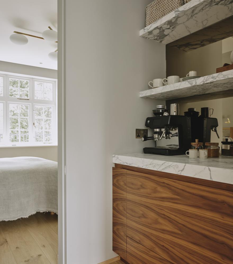 Adjoining the bedroom is a small kitchenette designed in walnut, to house a coffee machine and kettles etc, with a fridge area for cold drinks.