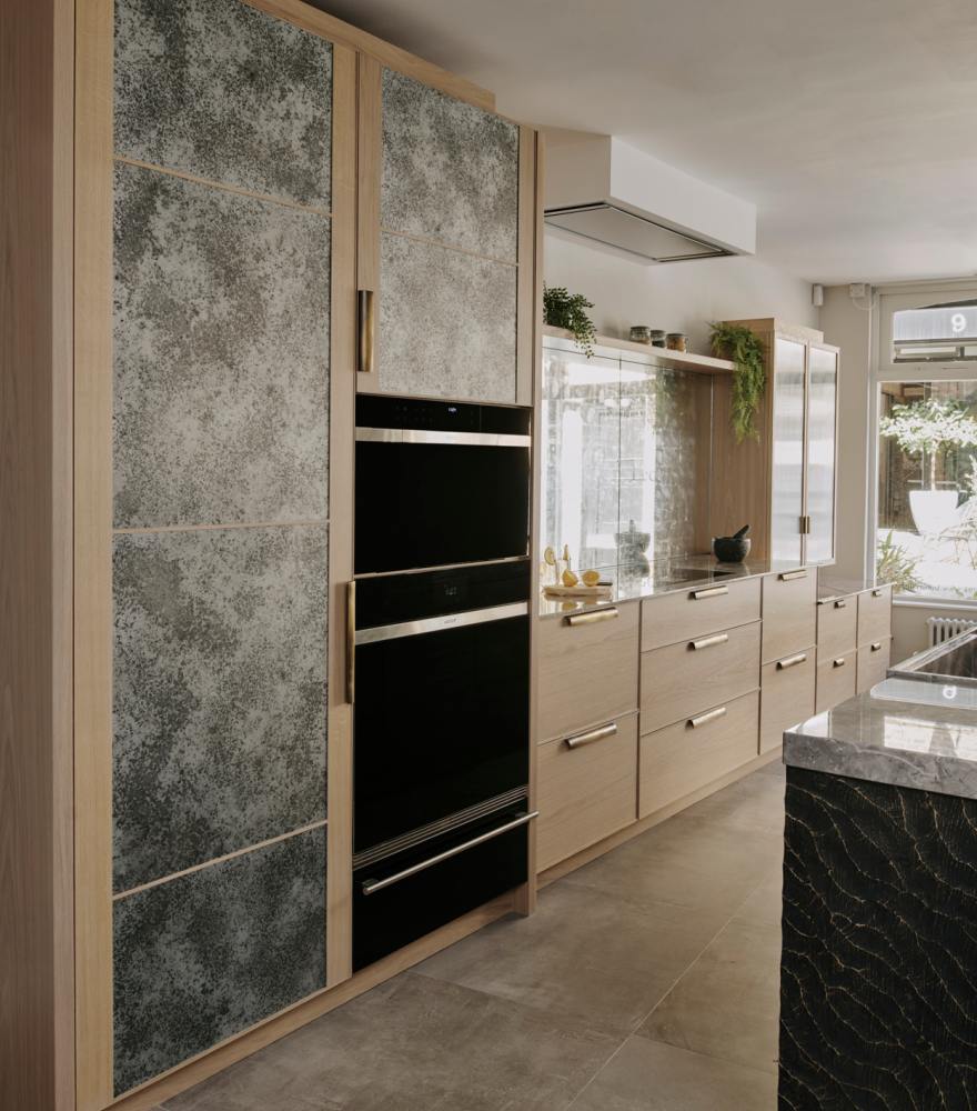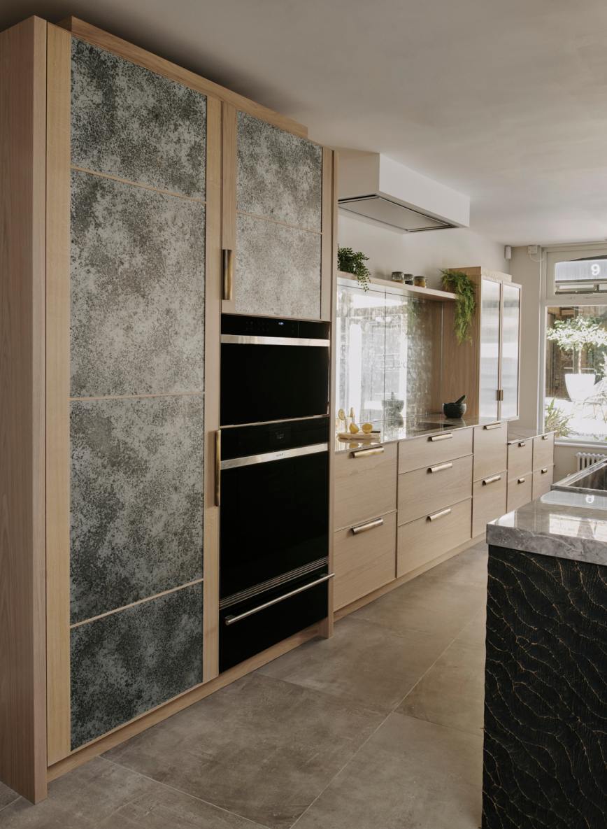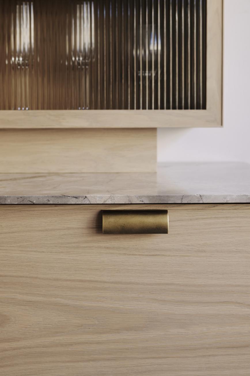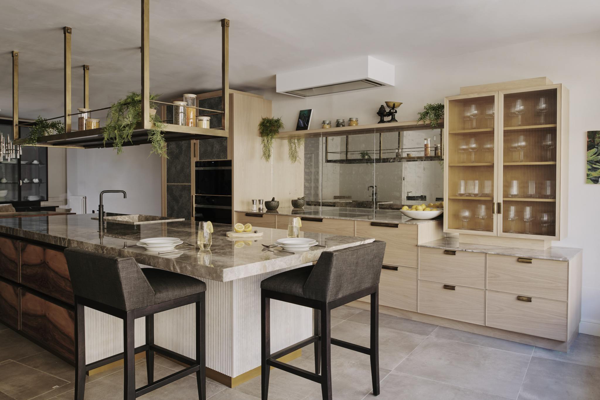 We are excited to unveil our new display in the Notting Hill showroom, bringing together many of our signature metallic and wood finishes in a new and exciting way. The island showcases our beautiful new wild walnut panels and white washed fluting which is illuminated from above by the led lighting concealed in the aged brass hanging rack and shelf. The oak cupboards surrounding the hob are rubbed back to expose the grain and finished with a pigmented pale wash , and patinated zinc panels on the tall housings sit within pale oak frames and side panels.