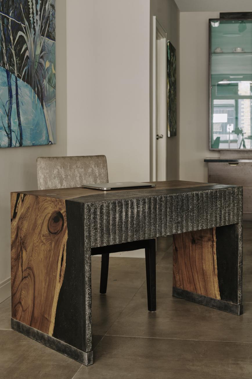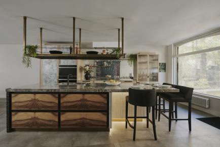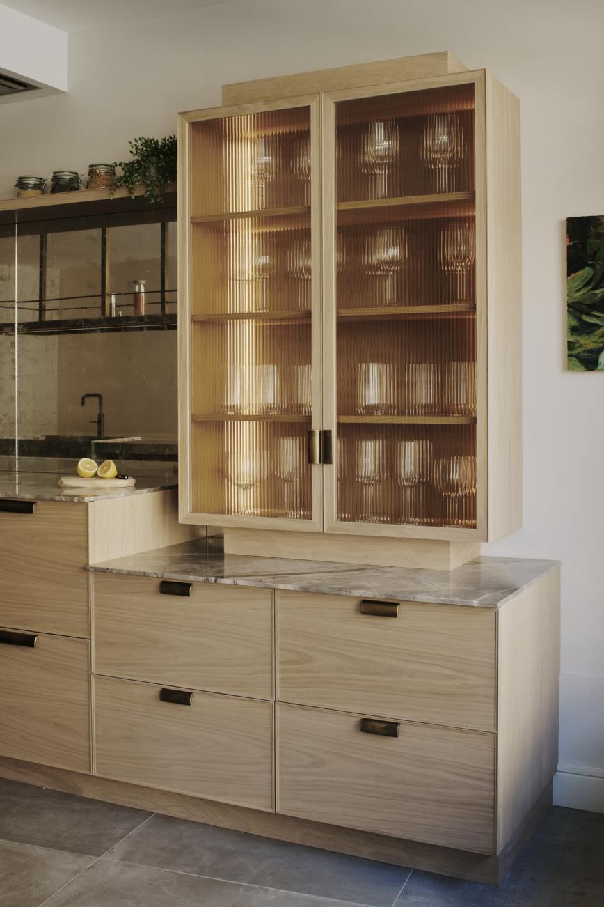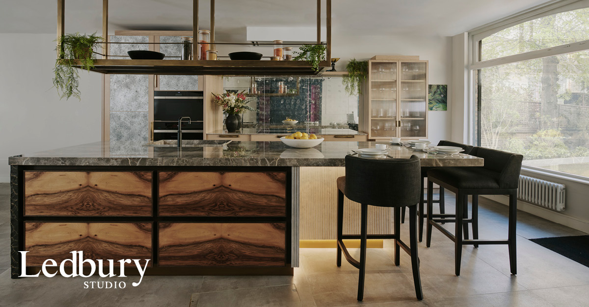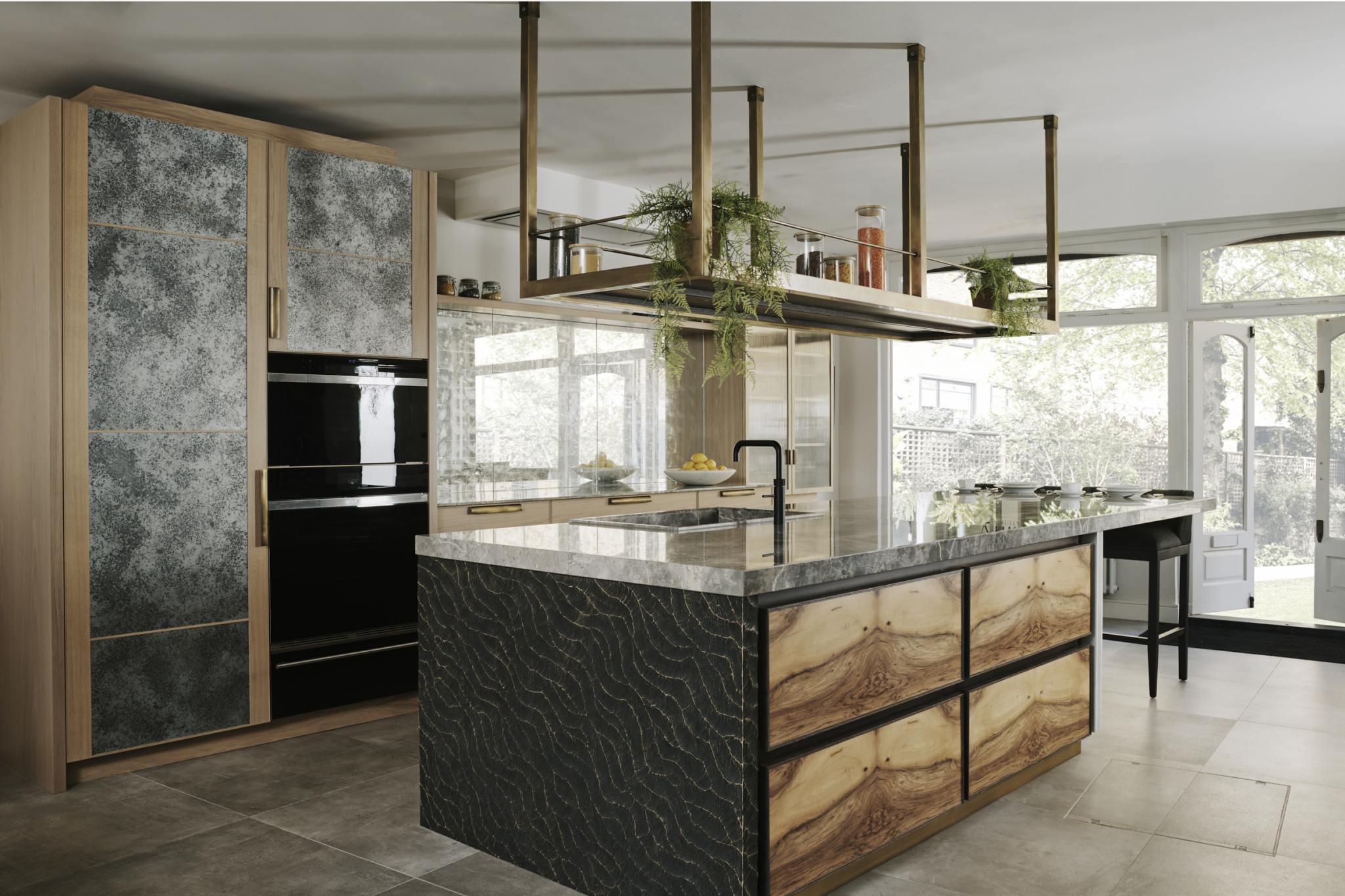 We are excited to unveil our new display in the Notting Hill showroom, bringing together many of our signature metallic and wood finishes in a new and exciting way. The island showcases our beautiful new wild walnut panels and white washed fluting which is illuminated from above by the led lighting concealed in the aged brass hanging rack and shelf. The oak cupboards surrounding the hob are rubbed back to expose the grain and finished with a pigmented pale wash , and patinated zinc panels on the tall housings sit within pale oak frames and side panels.