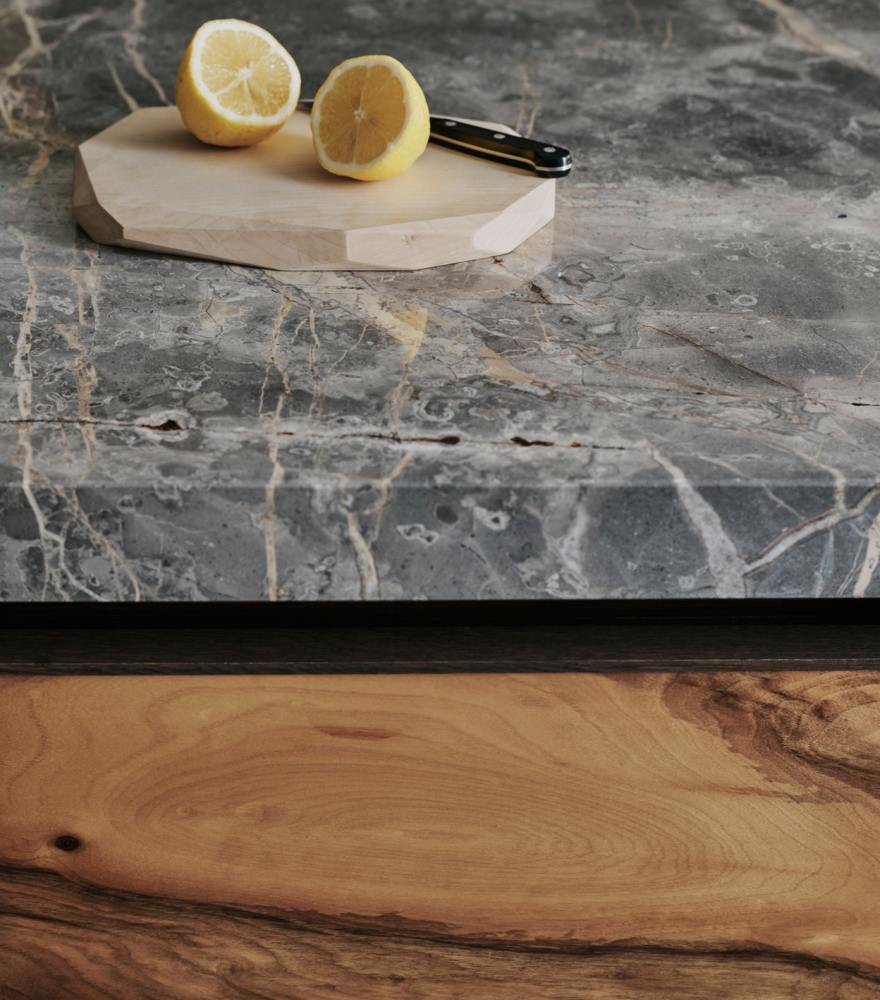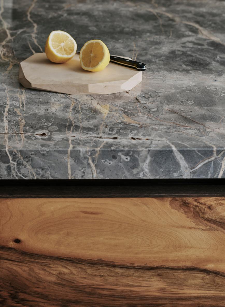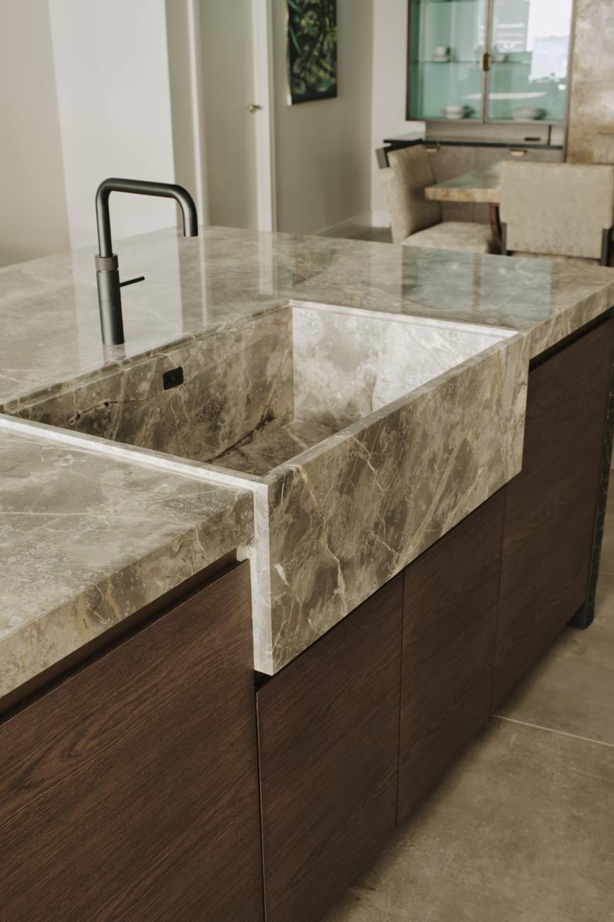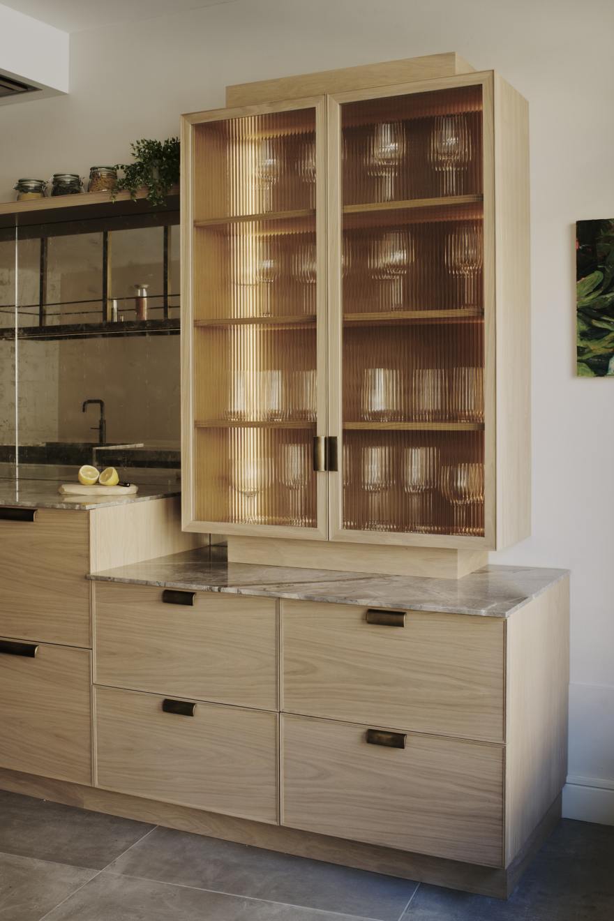 The look is completed with our own aged brass Francesca handles and a backsplash made from Verre Eglomise decorated with silver leaf. Finally a kicker made from liquid brass metal and the beautiful Fior di Bosco marble worktop and sink, bring all the elements of the design together to dramatic effect.