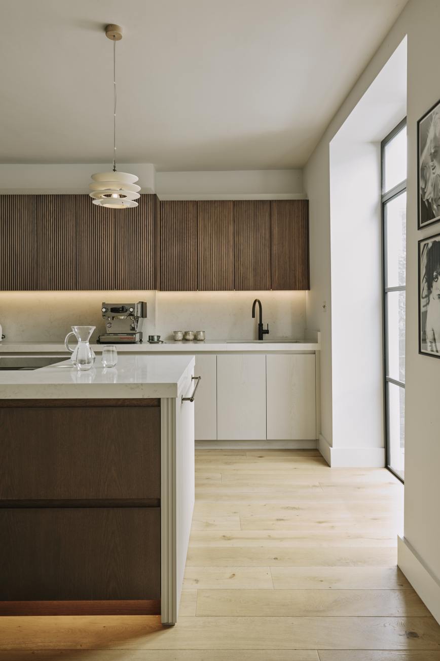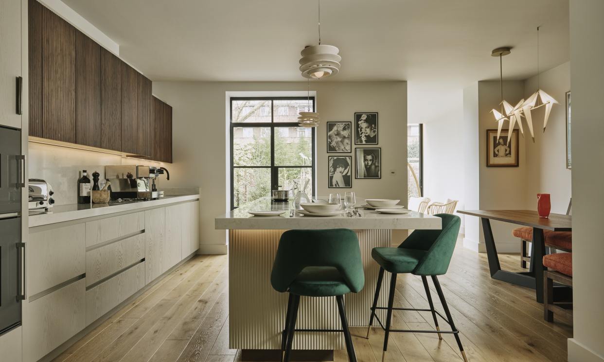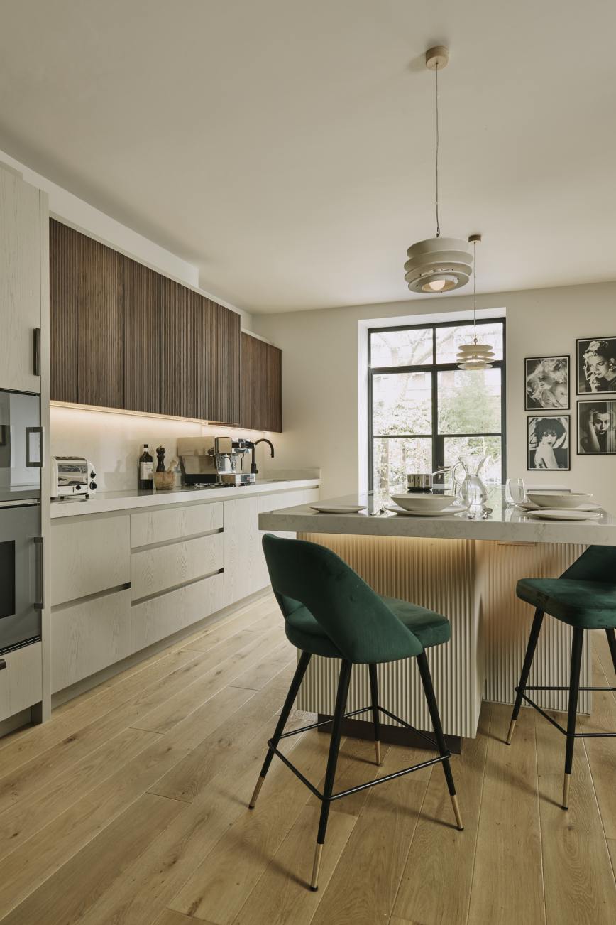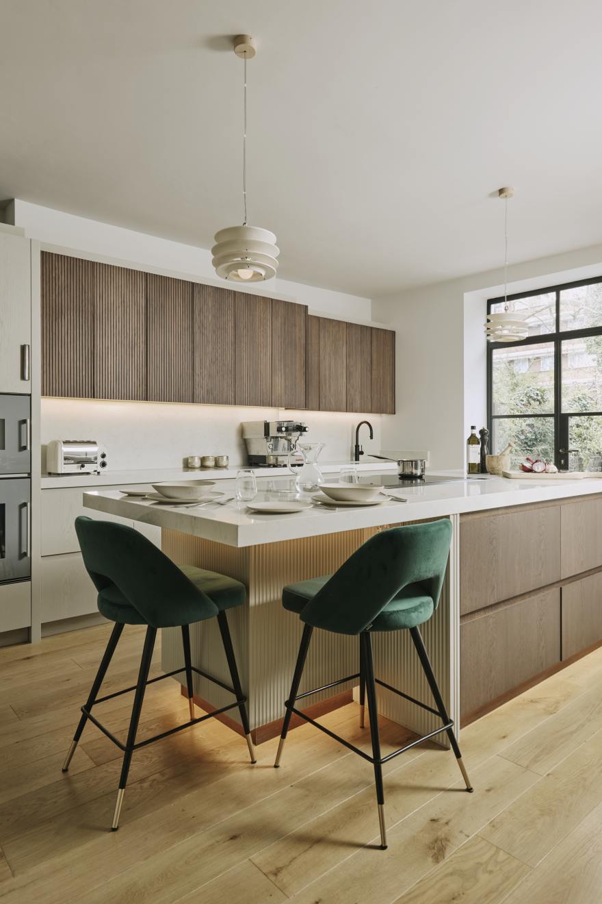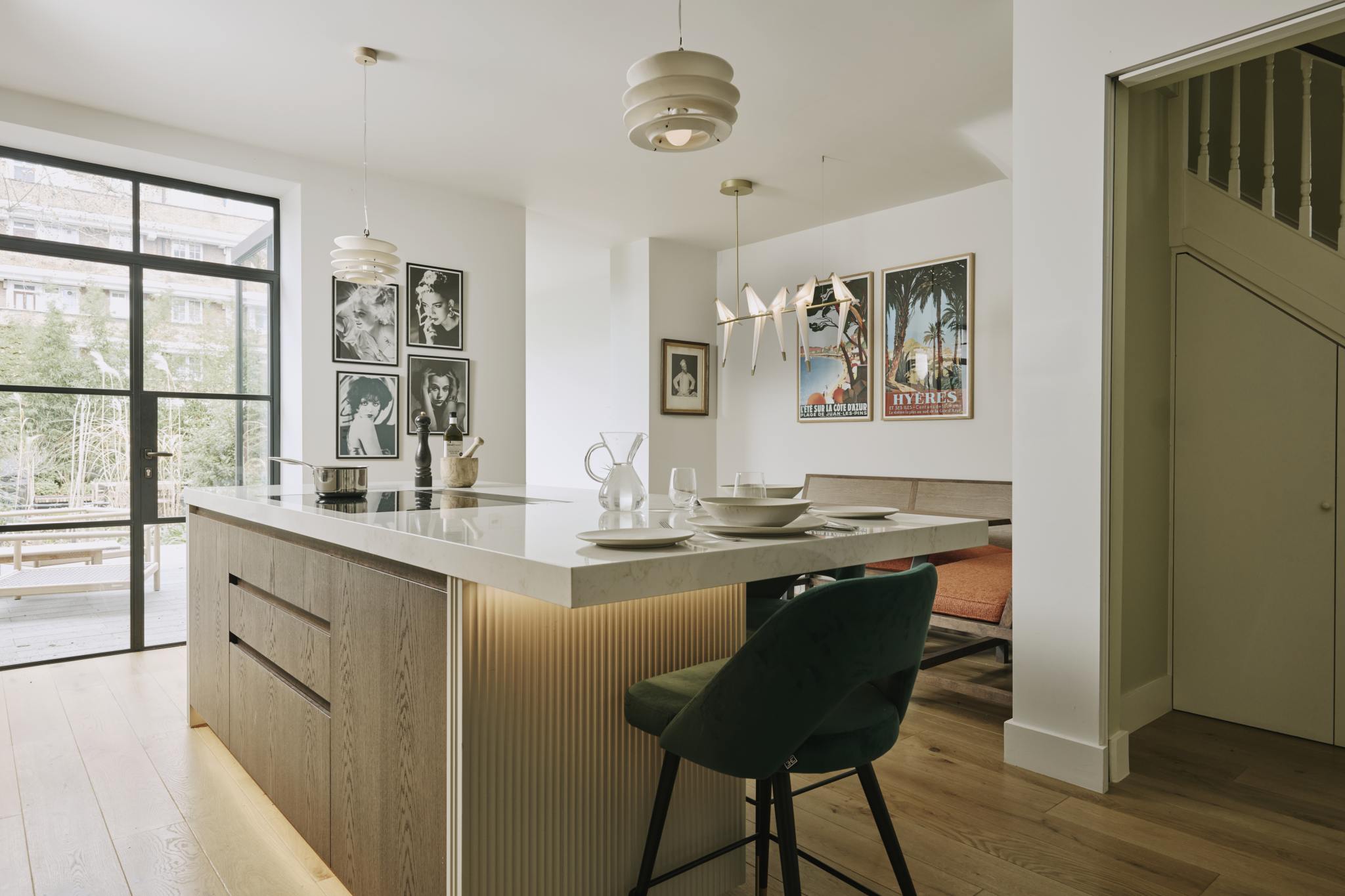 Our client spent 2 years refurbishing this beautiful Victorian house in Primrose Hill. Ledbury Studio was asked to design a contemporary kitchen in this open plan space incorporating a banquette dining area and sitting area in the conservatory at the back. Our client’s brief was that the kitchen should have a contemporary style without being clinical, so Charlie incorporated texture and different finishes throughout the kitchen; fluted oak cabinets crafted from dark stained oak were used on the wall above the sink and painted fluted panels add interest on the island.