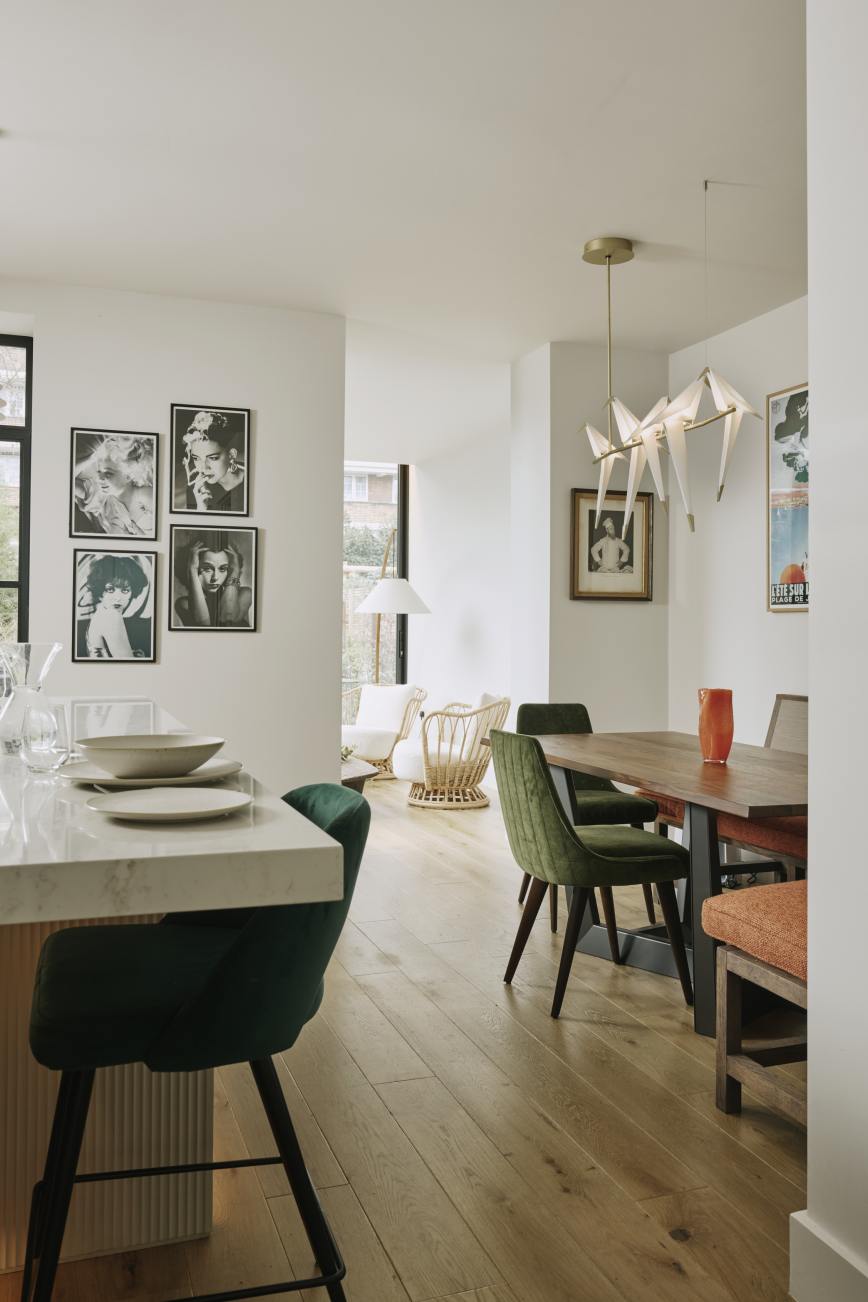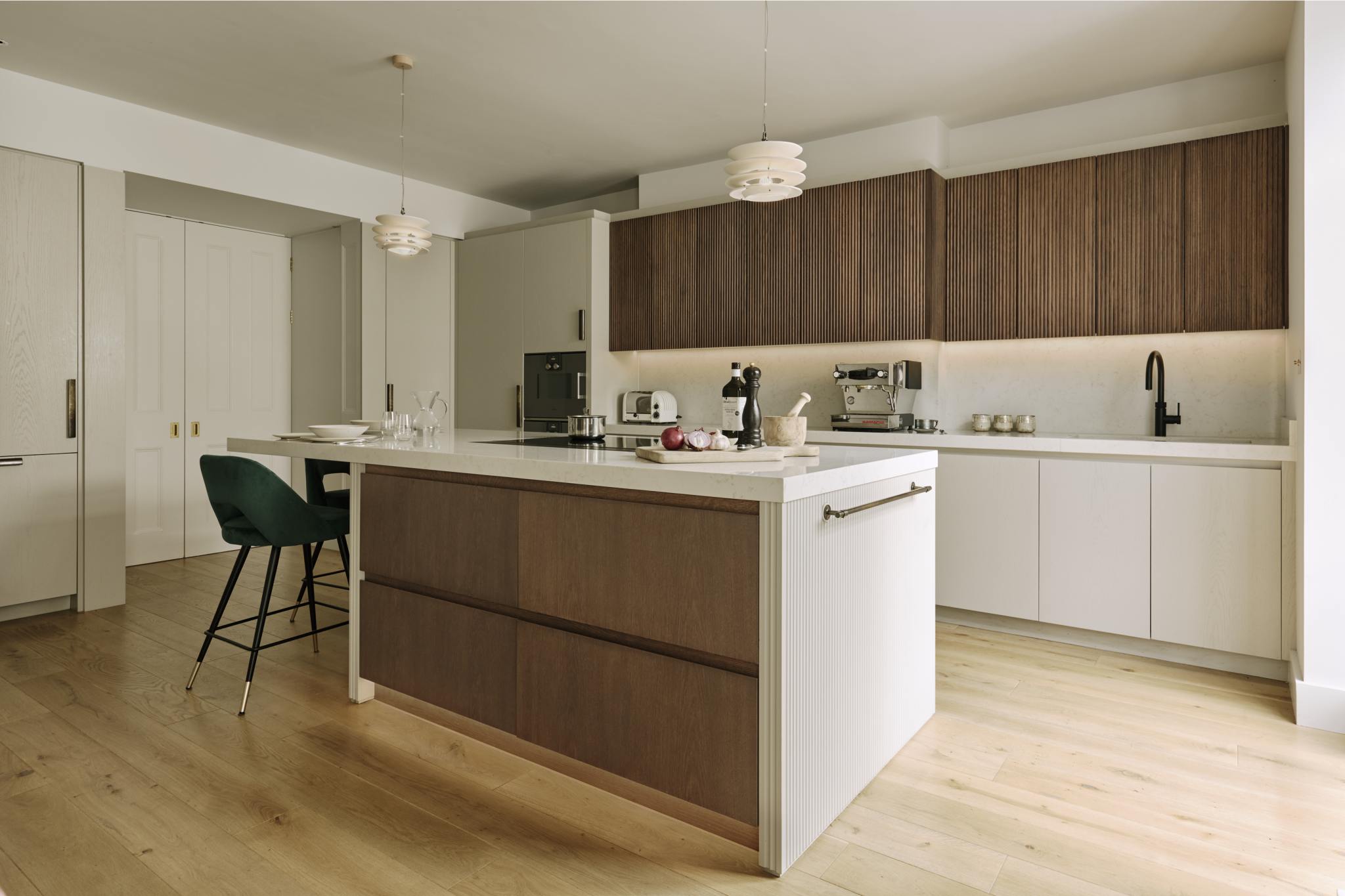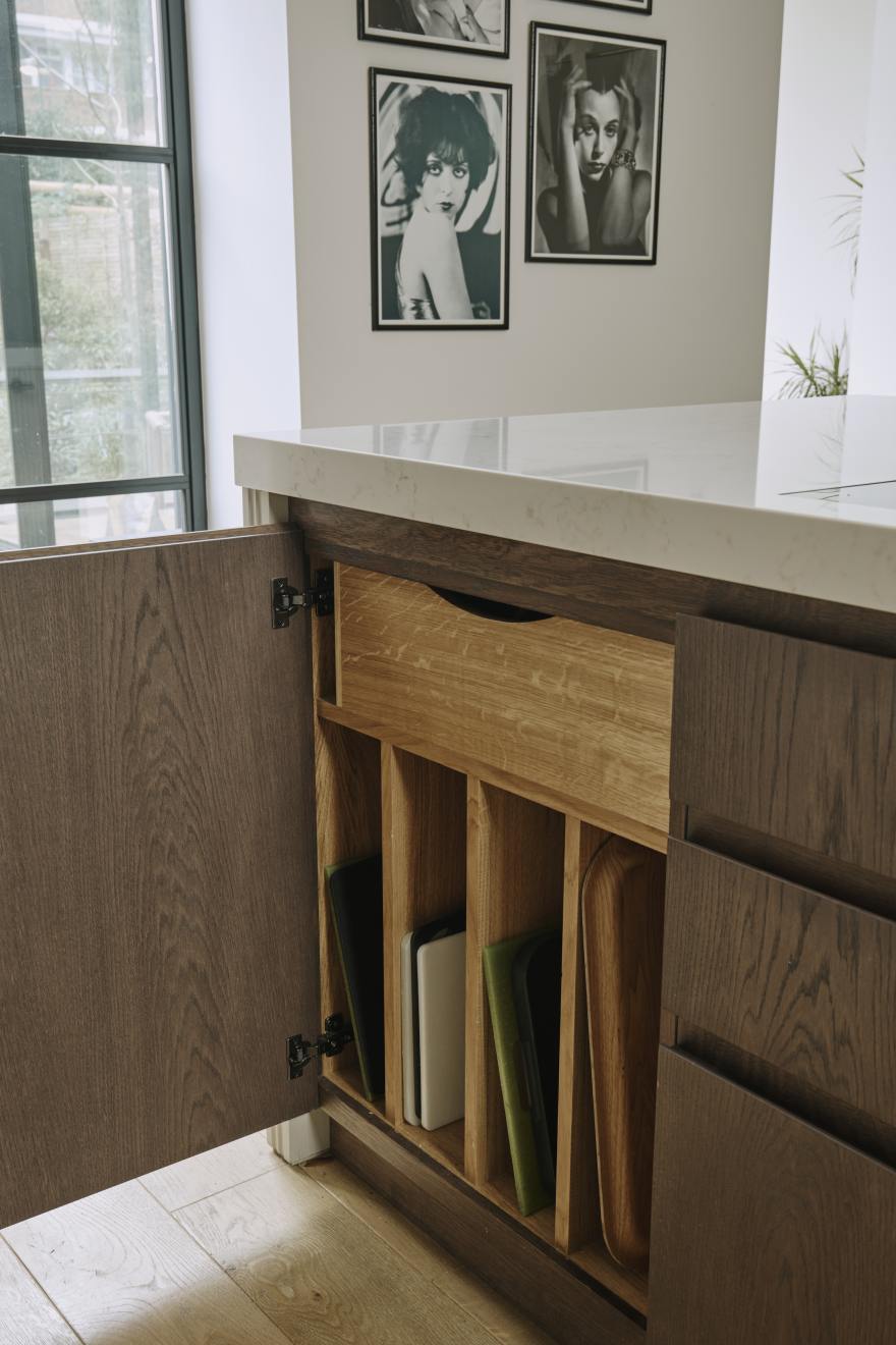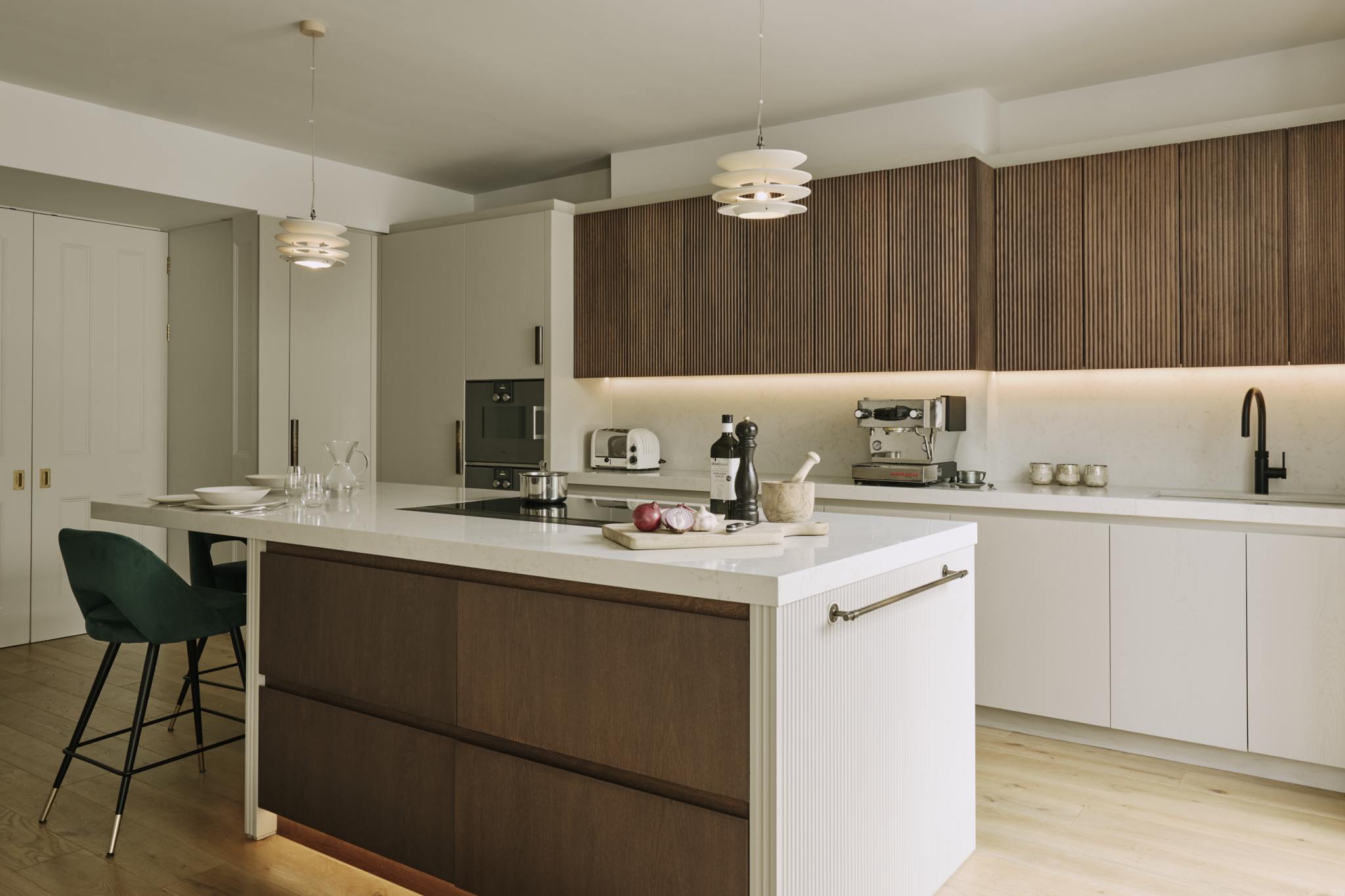 Our client spent 2 years refurbishing this beautiful Victorian house in Primrose Hill. Ledbury Studio was asked to design a contemporary kitchen in this open plan space incorporating a banquette dining area and sitting area in the conservatory at the back. Our client’s brief was that the kitchen should have a contemporary style without being clinical, so Charlie incorporated texture and different finishes throughout the kitchen; fluted oak cabinets crafted from dark stained oak were used on the wall above the sink and painted fluted panels add interest on the island.