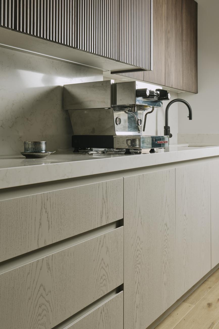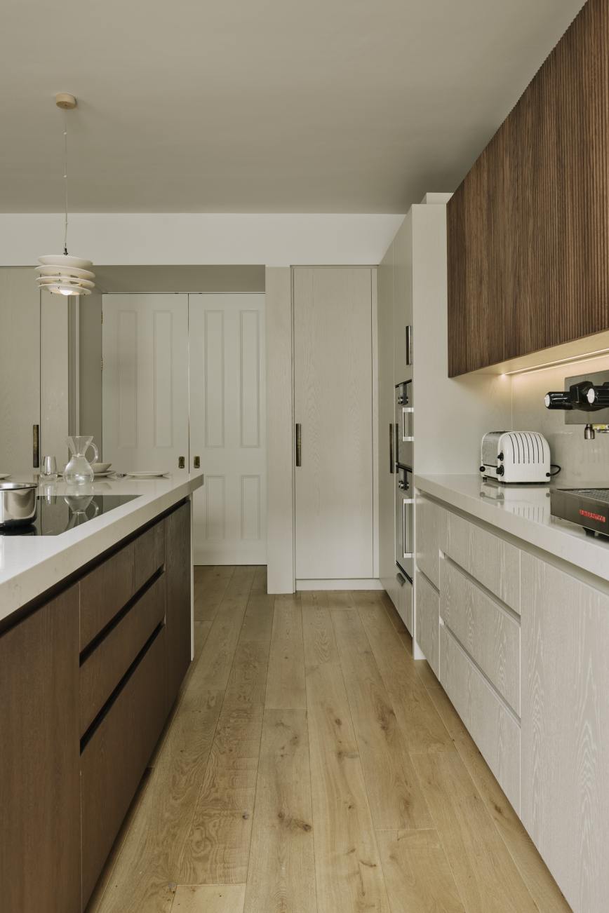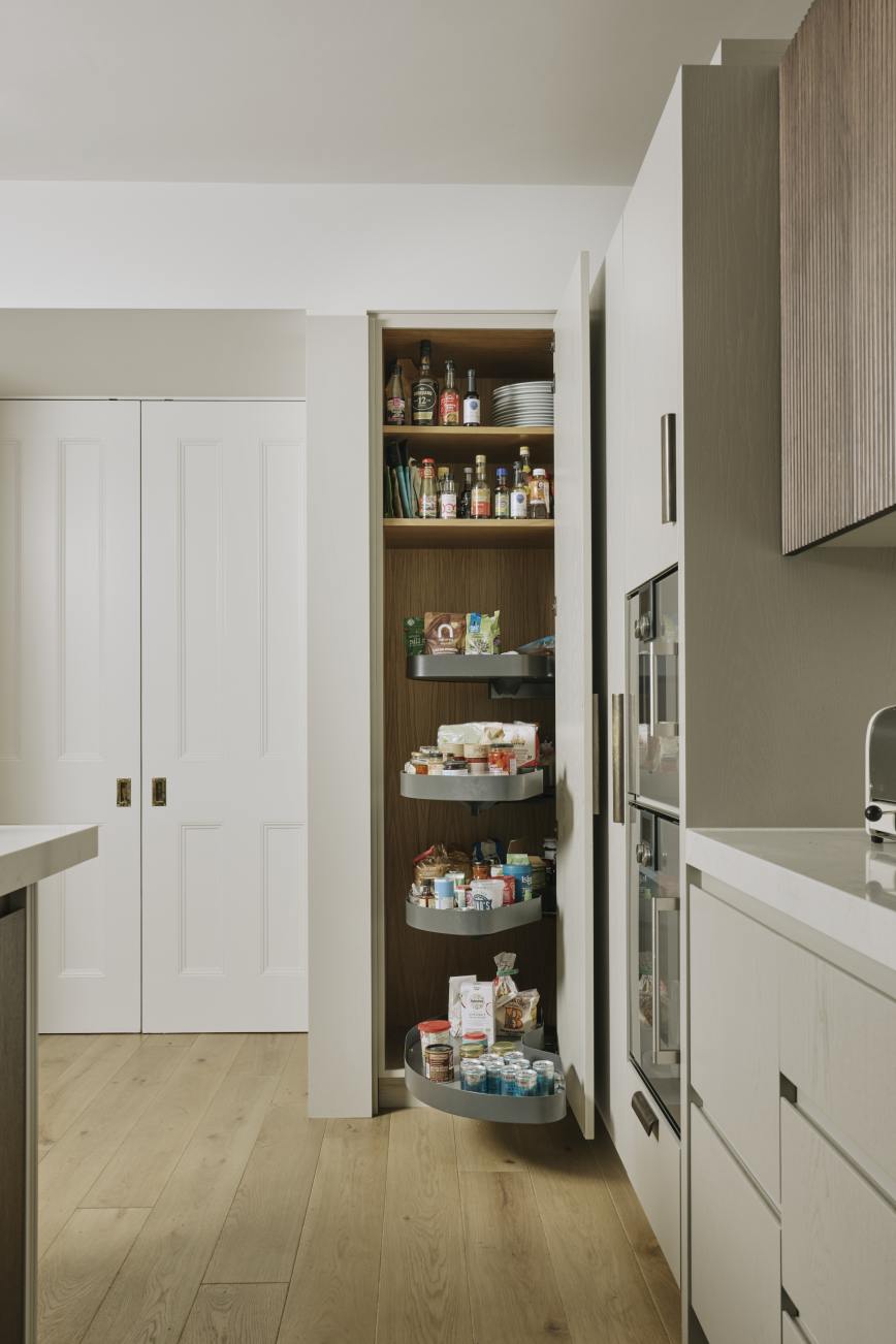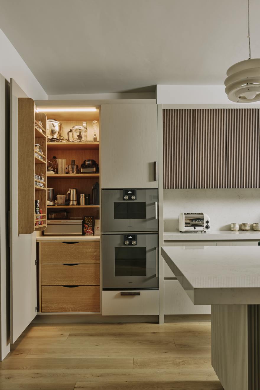 Painted oak panels to show the grain of the wood are used on the base cupboards to add further texture, while the tall cupboards have Ledbury’s signature patinated brass Francesca handles as a feature. Understated amber quartz worktops and splashbacks complete the scheme in this kitchen full of contemporary charm and understated chic.