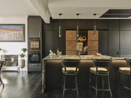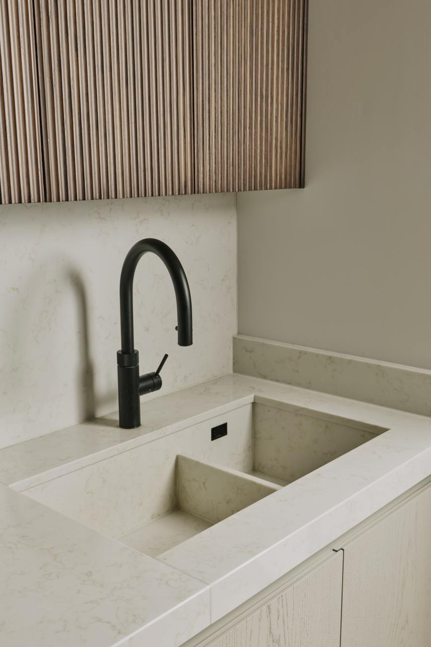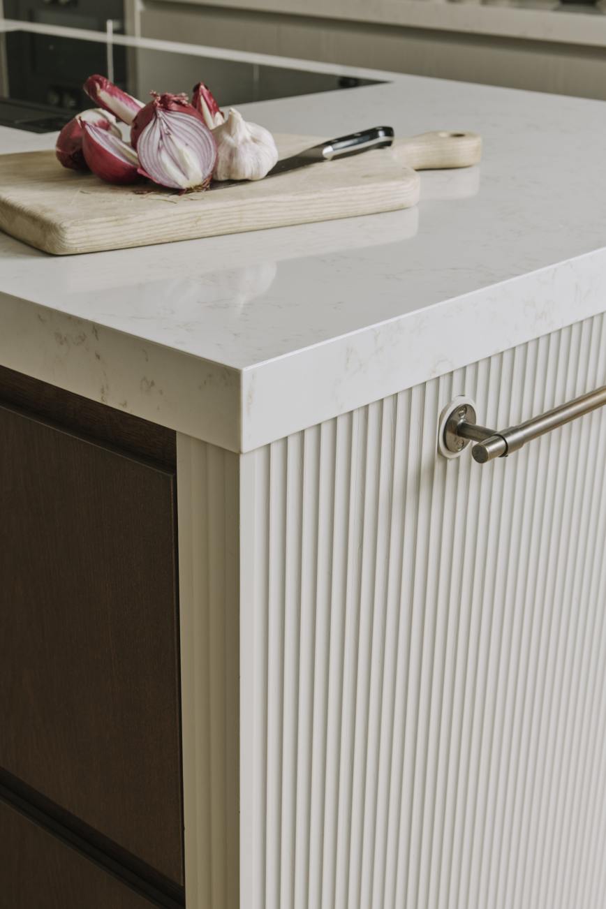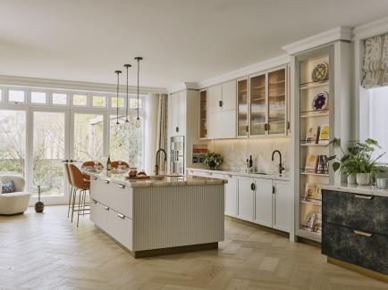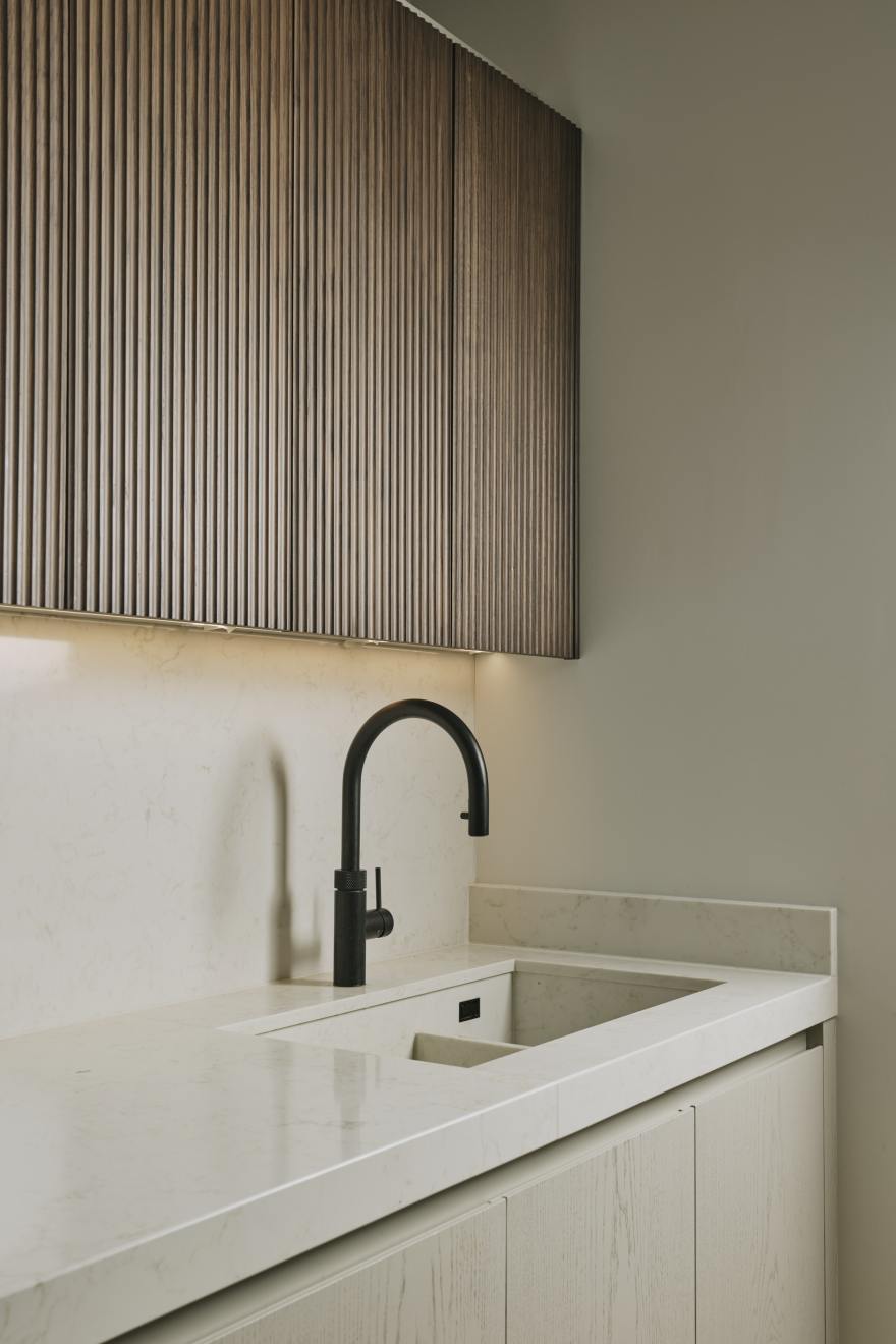 Painted oak panels to show the grain of the wood are used on the base cupboards to add further texture, while the tall cupboards have Ledbury’s signature patinated brass Francesca handles as a feature. Understated amber quartz worktops and splashbacks complete the scheme in this kitchen full of contemporary charm and understated chic.